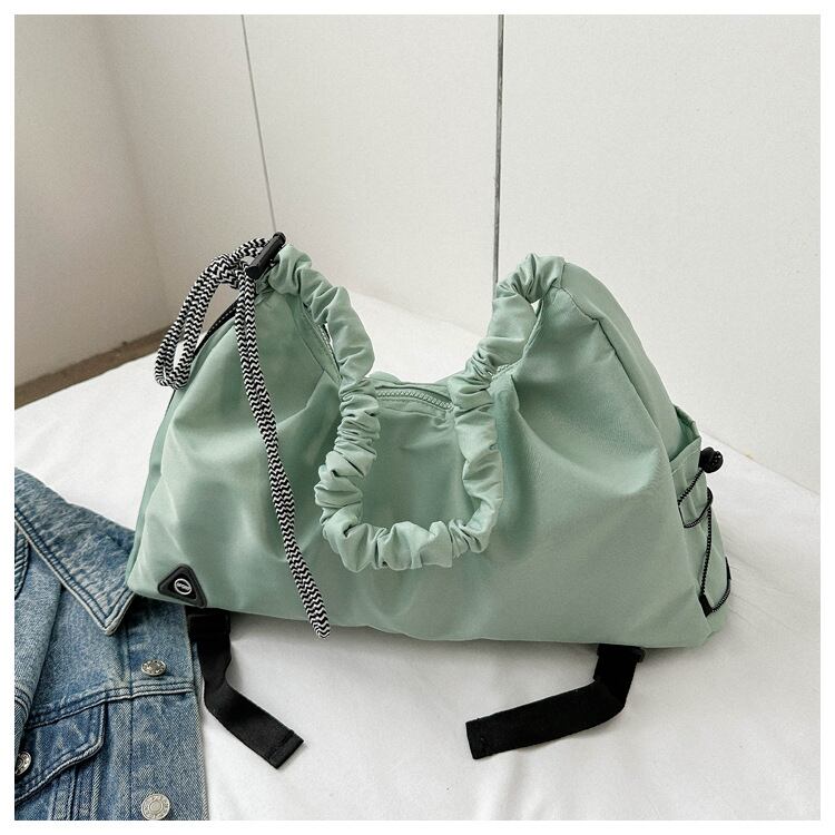約0.3kgと超軽量ながら、見た目以上の収納力があり、財布・スマホ・コスメ・水筒など必要なものをしっかり収納可能。ドローストリング付きで開閉もスムーズ、さらにサイドポケットも便利で使い勝手抜群。フリル持ち手は肩掛けもラクで、長時間の使用でもストレスを感じさせません。