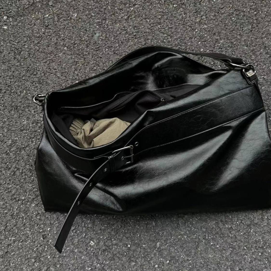 ベルトデザインが印象的なこちらのショルダーバッグは、モード感とストリート感を絶妙に融合したスタイリッシュなアイテム。艶感のあるフェイクレザー素材が高級感を演出し、シンプルなコーデにプラスするだけで一気におしゃれ度がアップします。A4サイズも楽々入る大容量なので、デイリー使いから通勤・通学、ショッピングまで幅広く活躍します。