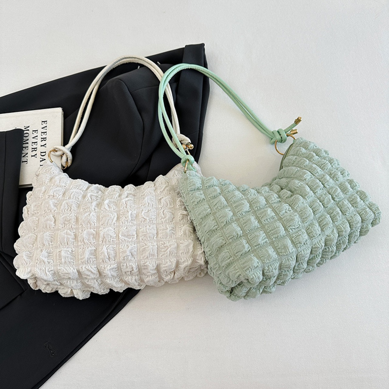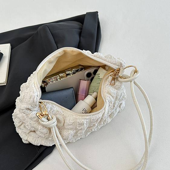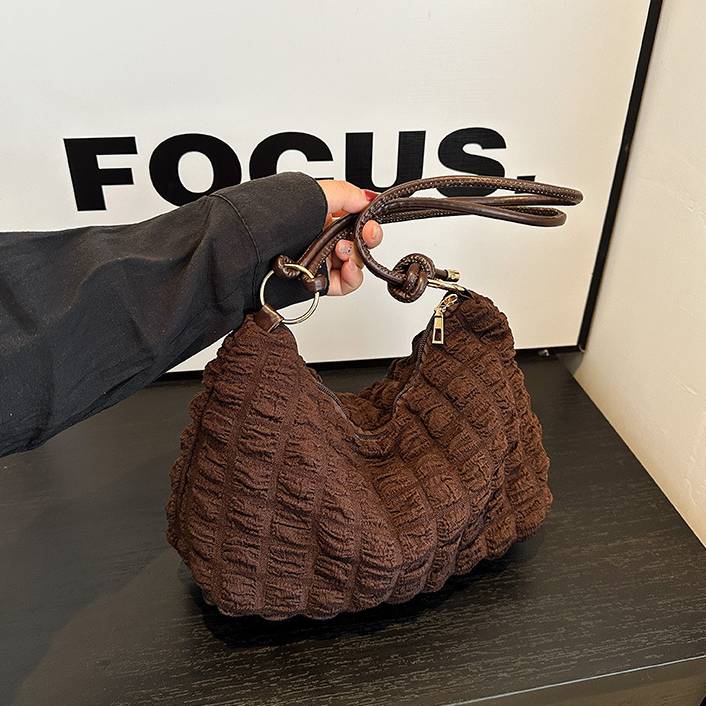 肌触り抜群のふわふわ生地が魅力のワンショルダーバッグ。表面は立体的な格子模様で、シンプルながら個性をプラス。カジュアルからフェミニンなコーデまで幅広くマッチする万能アイテムです。