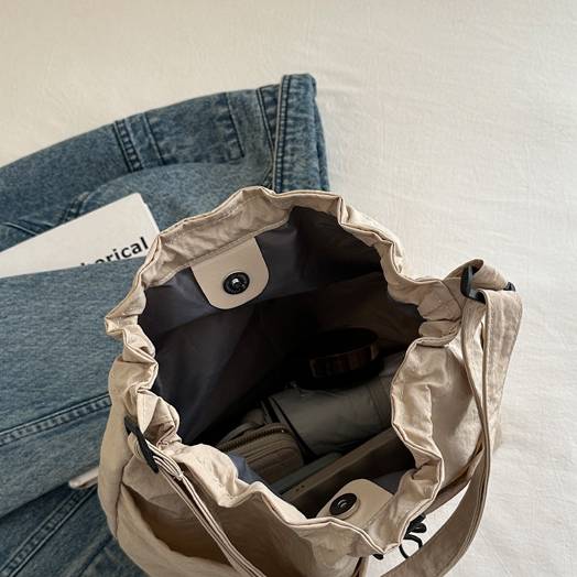 ナチュラルな風合いと程よいカジュアルさが魅力の、巾着タイプのショルダーバッグ。軽量かつ大容量設計で、デイリー使いからちょっとしたお出かけまで幅広く活躍します。シンプルなデザインながら、外ポケットや調整可能なショルダーストラップが機能性も抜群。