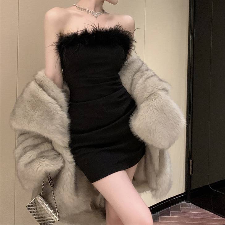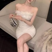 海外セレブ風のファッションを楽しみたい方や、トレンドを取り入れたい女性におすすめ。高級感のあるフェザーとタイトなシルエットの組み合わせで、特別な日の装いをさらに格上げしてくれます。