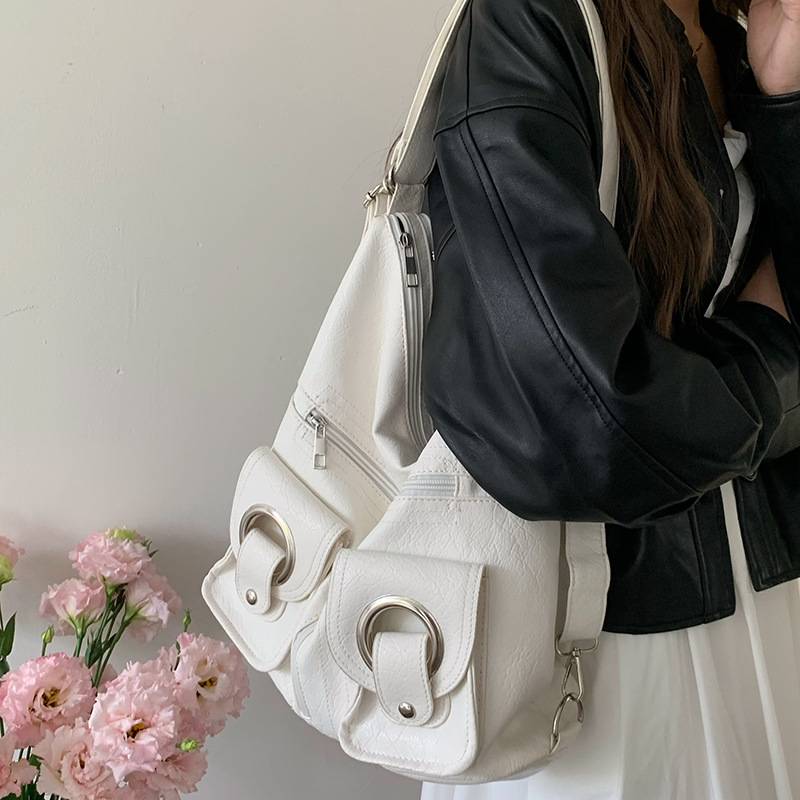 バッグの形はくたっと感のあるソフトなフォルムで、A4サイズもすっぽり収納できる大容量。通勤・通学・お出かけ・旅行など、さまざまなシーンで活躍します。荷物が多い日も、しっかり収納できる安心の収納力が魅力です。トレンドのY2Kや韓国ファッションにぴったりなデザインで、スタイルのアクセントにもなります。