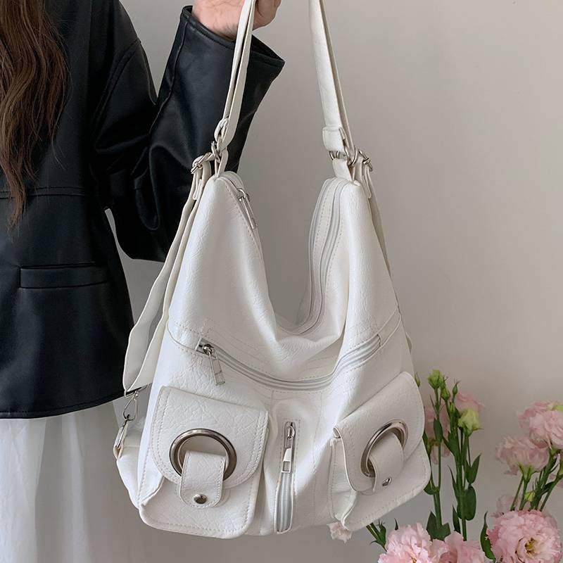 バッグの形はくたっと感のあるソフトなフォルムで、A4サイズもすっぽり収納できる大容量。通勤・通学・お出かけ・旅行など、さまざまなシーンで活躍します。荷物が多い日も、しっかり収納できる安心の収納力が魅力です。トレンドのY2Kや韓国ファッションにぴったりなデザインで、スタイルのアクセントにもなります。