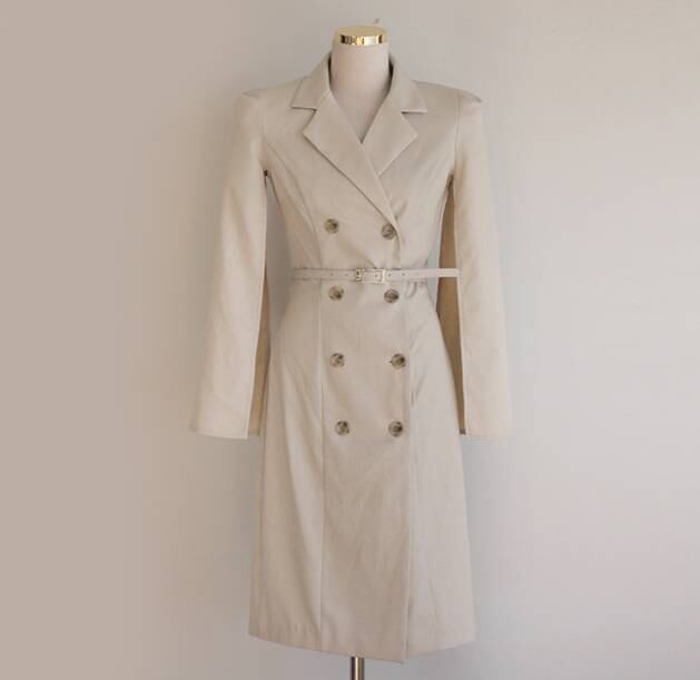 二重ボタンと細ベルトでウエストを引き締め、スタイルアップを叶えます。肩から流れるケープスリーブが動くたびにエレガントに揺れ、女性らしい魅力を最大限に引き立てる一着。
