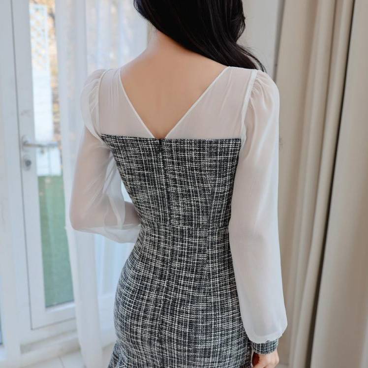 ツイード ワンピース ミニワンピース 長袖 レディース きれいめ 上品 韓国風 スクエアネック フレア裾 パールボタン 透け感 スリーブ デート 通勤 通学 お呼ばれ 結婚式 二次会 春 夏 秋 冬 大人可愛い フェミニン おしゃれ 人気 トレンド 20代 30代 40代 グレー 体型カバー ファッション C-OSS0134