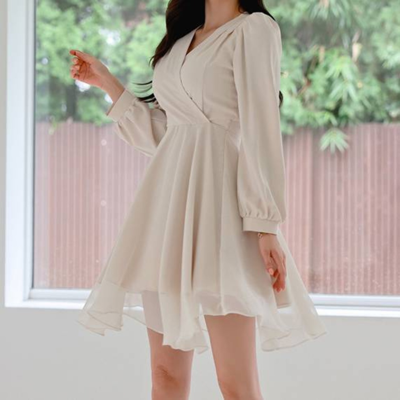 シフォン ワンピース フレアワンピース Aライン 長袖 レディース ミニ丈 ひざ上丈 きれいめ 上品 大人可愛い 清楚 韓国風 通勤 通学 デート お呼ばれ 結婚式 二次会 春 夏 秋 冬 20代 30代 40代 女性向け 人気 トレンド フェミニン ナチュラル 体型カバー エレガント ベージュ おしゃれ ファッション C-OSS0131