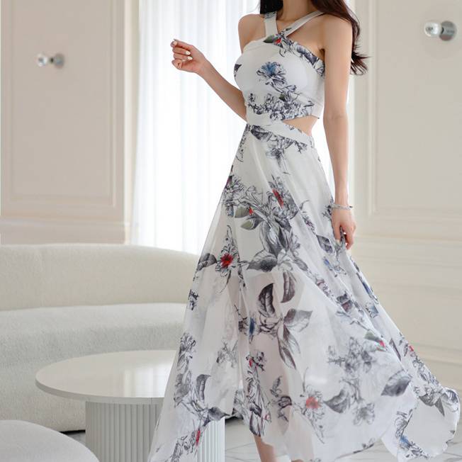 リゾート感あふれるクロスストラップデザインのマキシワンピース。
