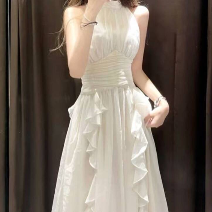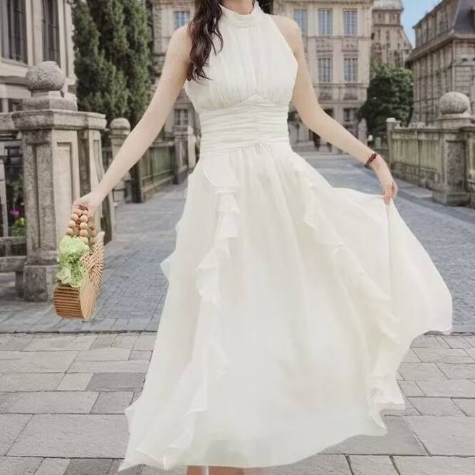 ロングワンピース レディース シフォン フリル ハイネック ノースリーブ フレア Aライン エレガント 清楚 上品 韓国風 きれいめ 美ライン ウエストマーク 春 夏 秋 冬 お呼ばれ デート 食事会 フォーマル リゾート パーティー 人気 大人可愛い ホワイト C-OSS0158