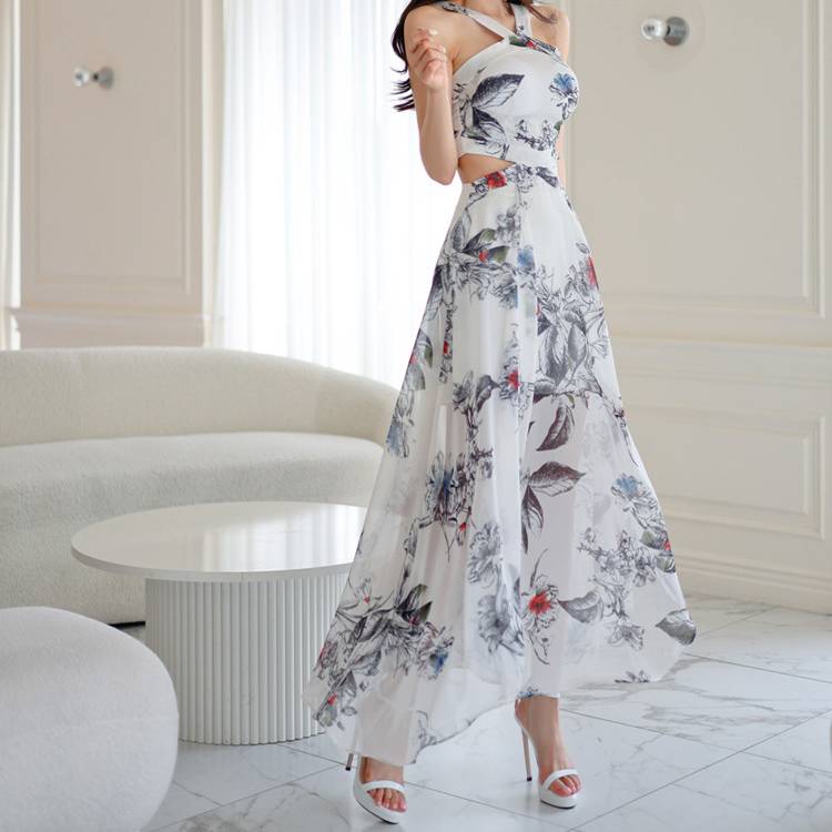 ブルー ホワイト ワンピース レディース マキシ丈 ロングドレス フレアワンピース クロスストラップ バックオープン リゾートドレス きれいめ エレガント 夏ワンピ 海外風 韓国ファッション リゾート お呼ばれ デート 旅行 ビーチ 高見え 大人可愛い トレンド 人気 上品 着痩せ シフォン素材 C-OSS0148