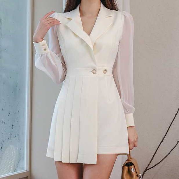 テーラード ワンピース シフォン袖 レディース ジャケット風 ミニワンピース 上品 きれいめ 韓国風 春 夏 秋 冬 ブラック ホワイト 2色展開 長袖風 美シルエット フォーマル お呼ばれ パーティー 通勤 OL オフィス デート 20代 30代 40代 着痩せ 高見え エレガント トレンド 人気 C-OSS0144