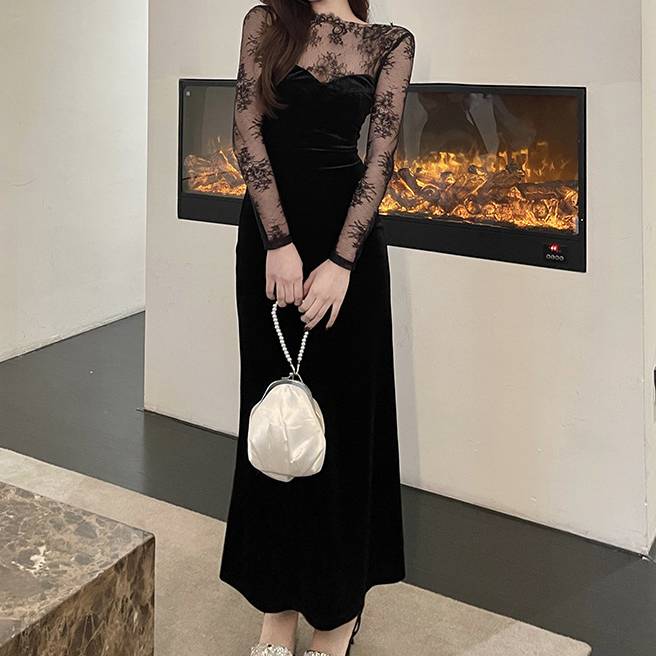 ベロア ロングドレス 黒 レース スリーブ シースルー レディース 上品 高級感 エレガント フォーマル マーメイドライン タイトドレス 韓国風 ワンピース 結婚式 二次会 披露宴 デート 20代 30代 40代 秋 冬 春 パーティー 発表会 お呼ばれ シースルー 長袖 美シルエット 着痩せ 高見え ブラック C-OSS0140