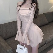 レディース ワンピース オフショルダー フレアスリーブ 長袖 ミニ丈 きれいめ セクシー Aライン スリム 体型カバー 春 秋 冬 韓国ファッション 大人可愛い 上品 デートコーデ 二次会 ブラック カーキ 2色展開 S M L 女性らしい美シルエット ミニドレス C-OSS0170