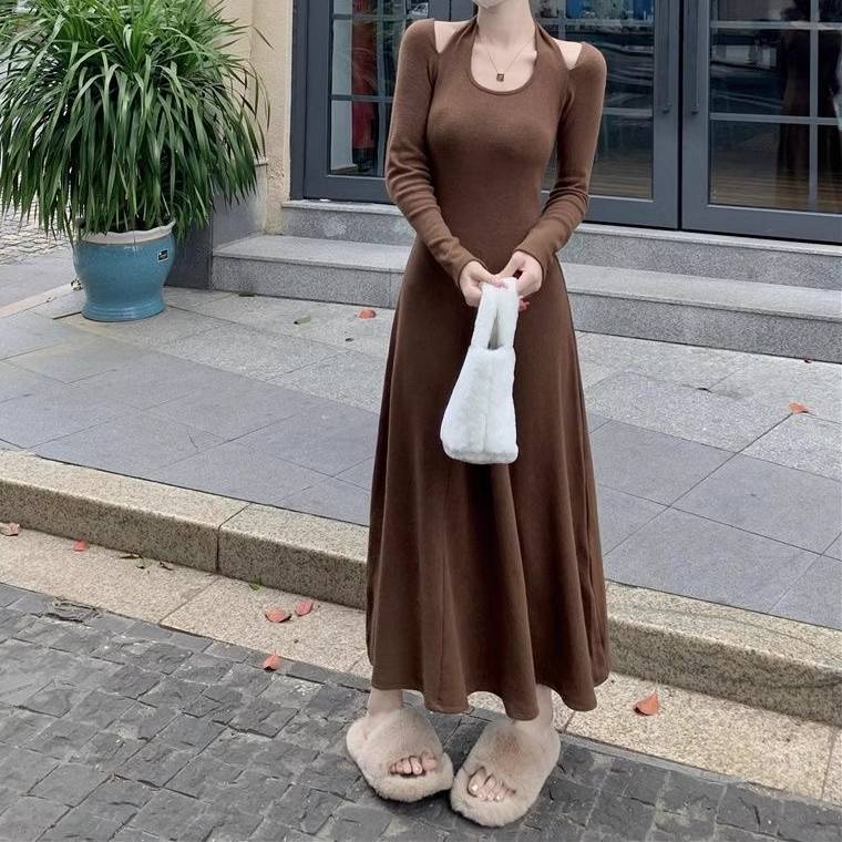 ワンピース ロングワンピース 秋冬 ニットワンピース カットアウト 肩あき ロング丈 シンプル 大人可愛い 韓国風 レディース きれいめ 上品 おしゃれ 可愛い フレア 長袖 体型カバー 美シルエット Aライン ブラウン ホワイト ベージュ 20代 30代 40代 カジュアル デート お出かけ 冬ワンピ C-OSS0221