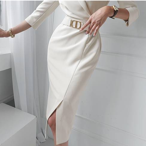 ホワイト ワンピース レディース ベルト付き タイトドレス ミディ丈 エレガント 上品 きれいめ 大人フェミニン 韓国風 通勤 オフィス デート お呼ばれ 二次会 結婚式 フォーマル スリット ワンピース 春 夏 秋 冬 オールシーズン 着回し おしゃれ 人気 トレンド C-OSS0194