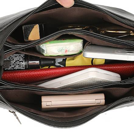 シンプルなデザインながら上品さと機能性を兼ね備えたレザー調ショルダーバッグ。