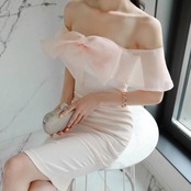 上品なオフショルダーラインと柔らかな透け感のフリルデザインが女性らしさを引き立てるタイトワンピース。胸元にはふんわりとしたリボンディテールを施し、優雅でフェミニンな印象を与えてくれる一着です。落ち着いた淡いピンクカラーが肌を明るく見せ、特別なシーンにもデイリーにも品よく馴染みます。