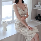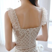 ノースリーブデザインと透け感のあるレースが軽やかな印象を与え、デートやパーティーなど特別なシーンにもぴったり。