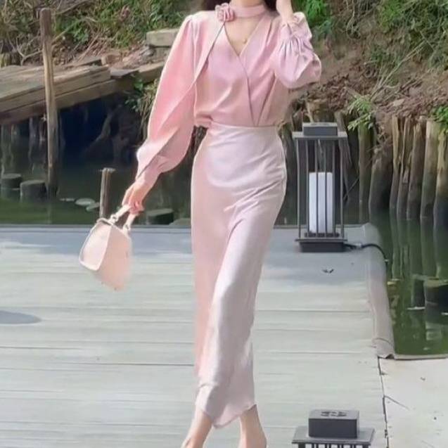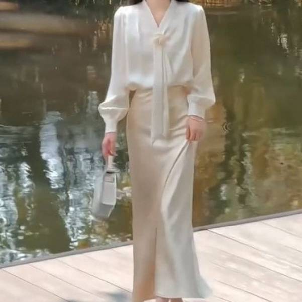 華やかで上品な印象を与える、リボンタイ付きブラウスとサテンロングスカートを組み合わせたセットアップ風ワンピース。