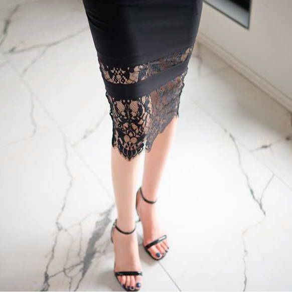 繊細なレースが上品に透ける、大人の女性の魅力を引き立てるタイトミディドレス。