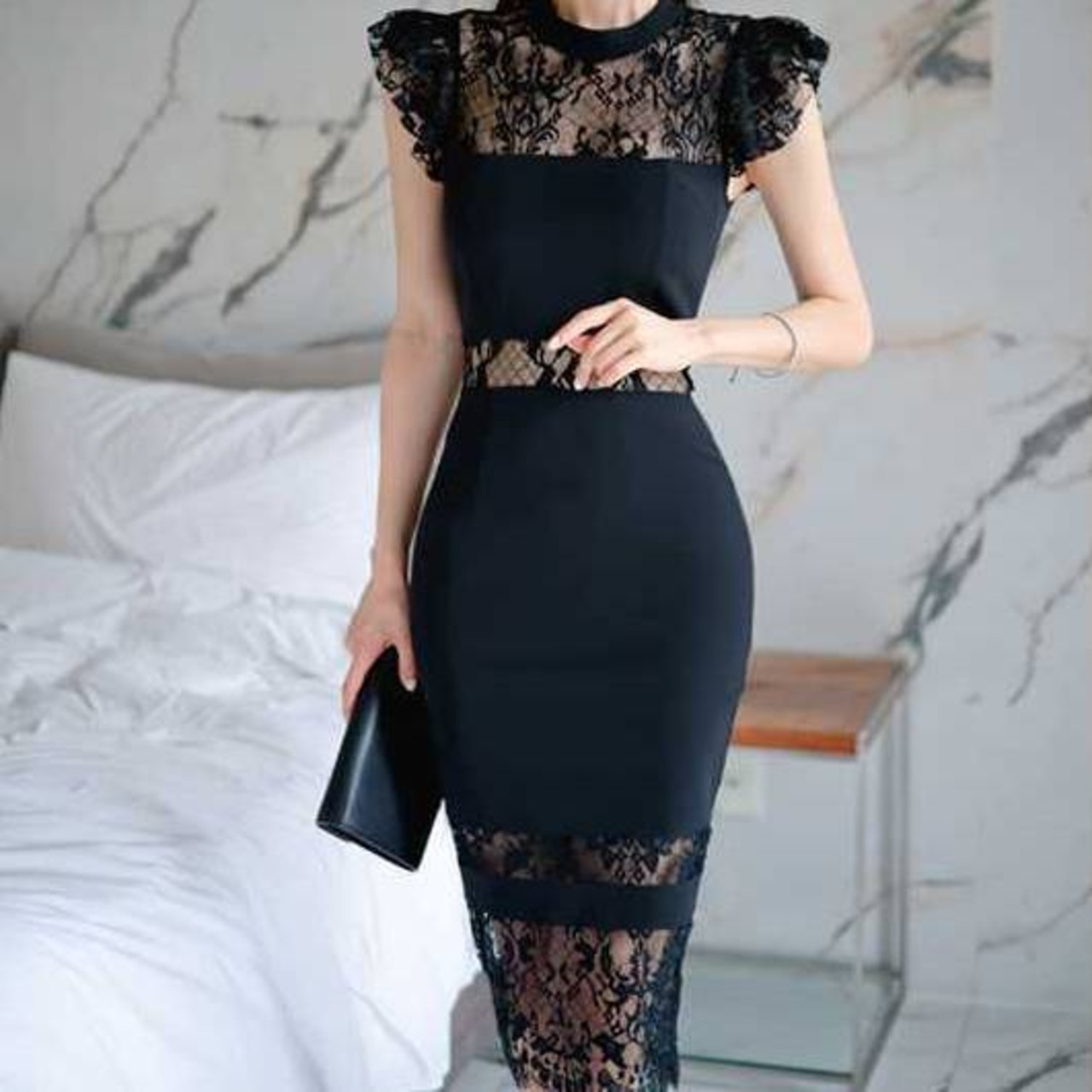 レースの透け感が映える照明の下で、女性らしさを最大限に引き立てます。