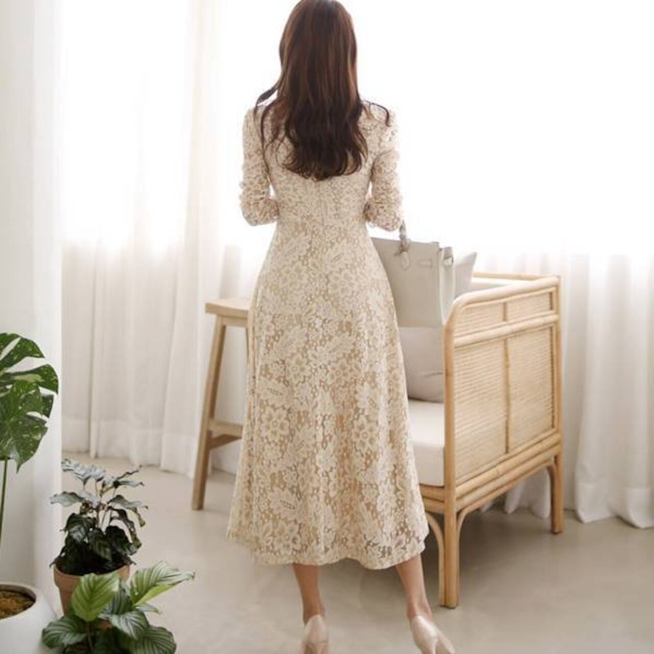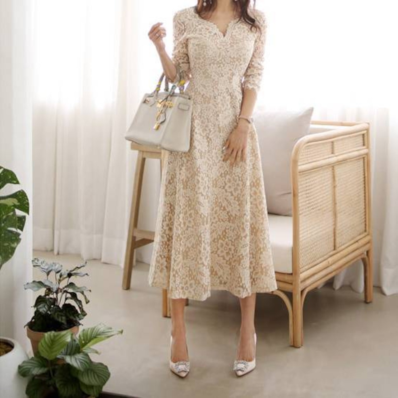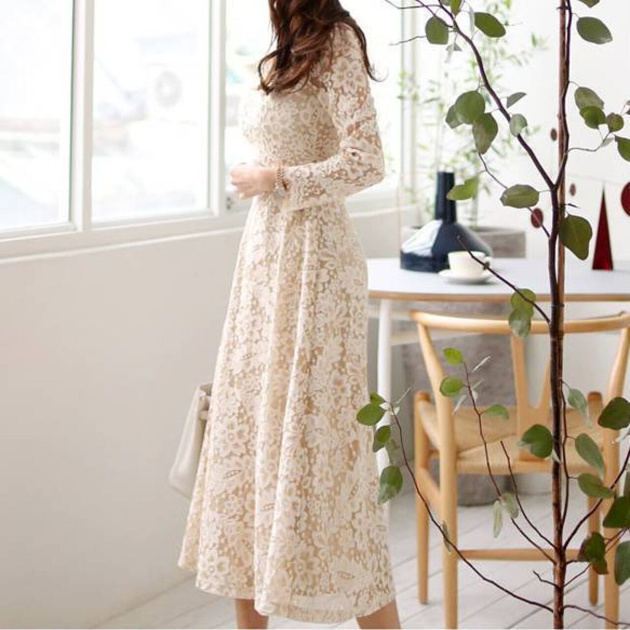 繊細な総レースが贅沢にあしらわれた、大人の女性の魅力を引き立てるミドルマキシワンピースです。ナチュラルで柔らかなベージュカラーが肌なじみよく、上品さを際立たせながらも華やかな印象に仕上げてくれます。デート、女子会、お呼ばれ、特別な1日にもぴったりの華やぎワンピースです。