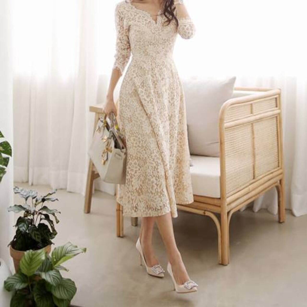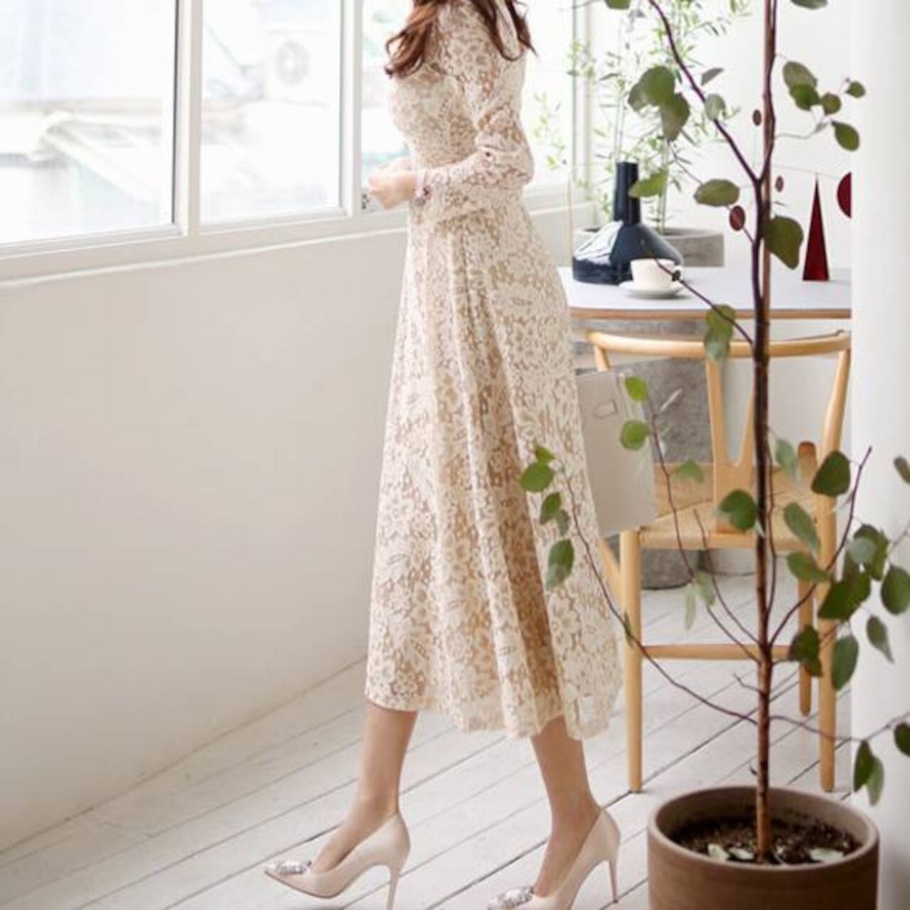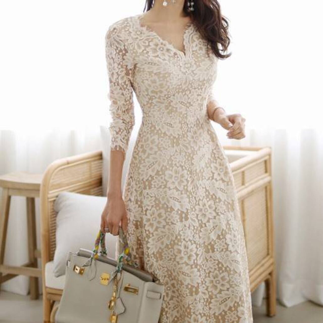 繊細な総レースが贅沢にあしらわれた、大人の女性の魅力を引き立てるミドルマキシワンピースです。ナチュラルで柔らかなベージュカラーが肌なじみよく、上品さを際立たせながらも華やかな印象に仕上げてくれます。デート、女子会、お呼ばれ、特別な1日にもぴったりの華やぎワンピースです。