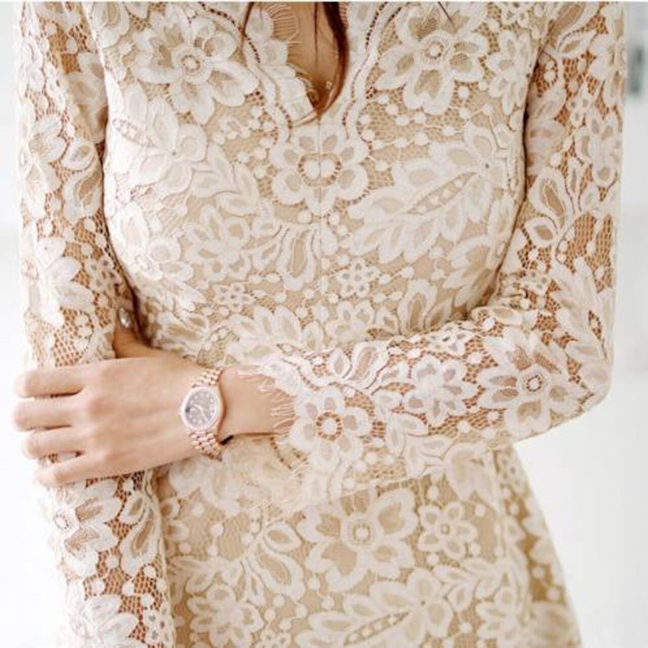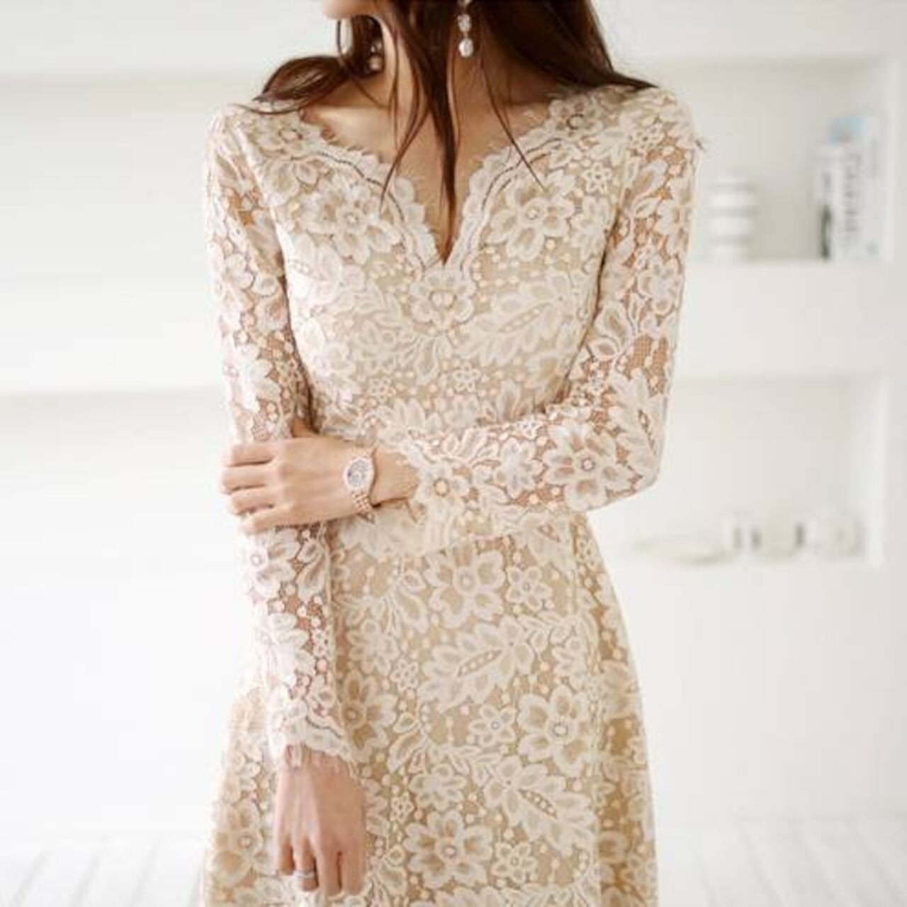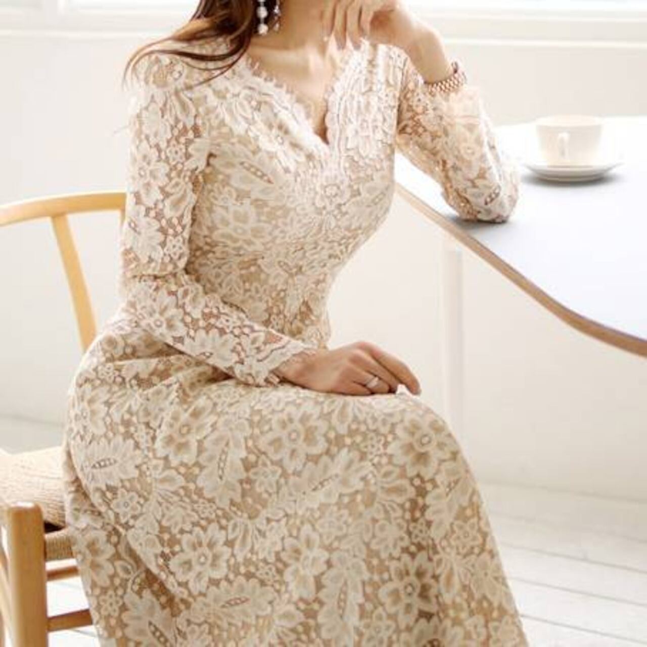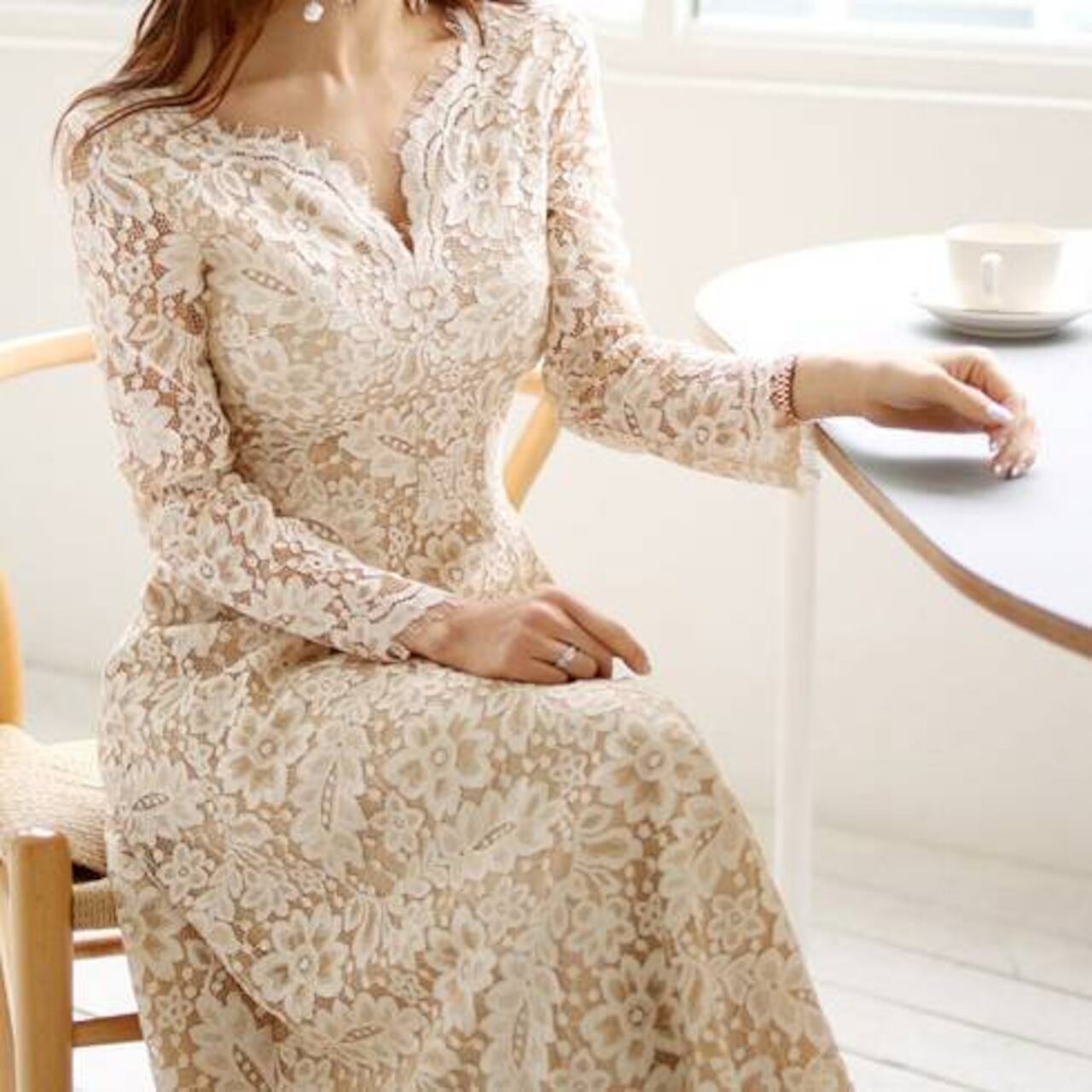 Vネックのやわらかなデザインと、ウエストラインを美しく見せるシルエットにより、スタイルアップ効果も抜群。長袖レースが腕を華奢に見せてくれるため、体型カバーも叶う嬉しい一着です。動くたびに繊細な柄が揺れ、フェミニンで魅力的な雰囲気を演出します。