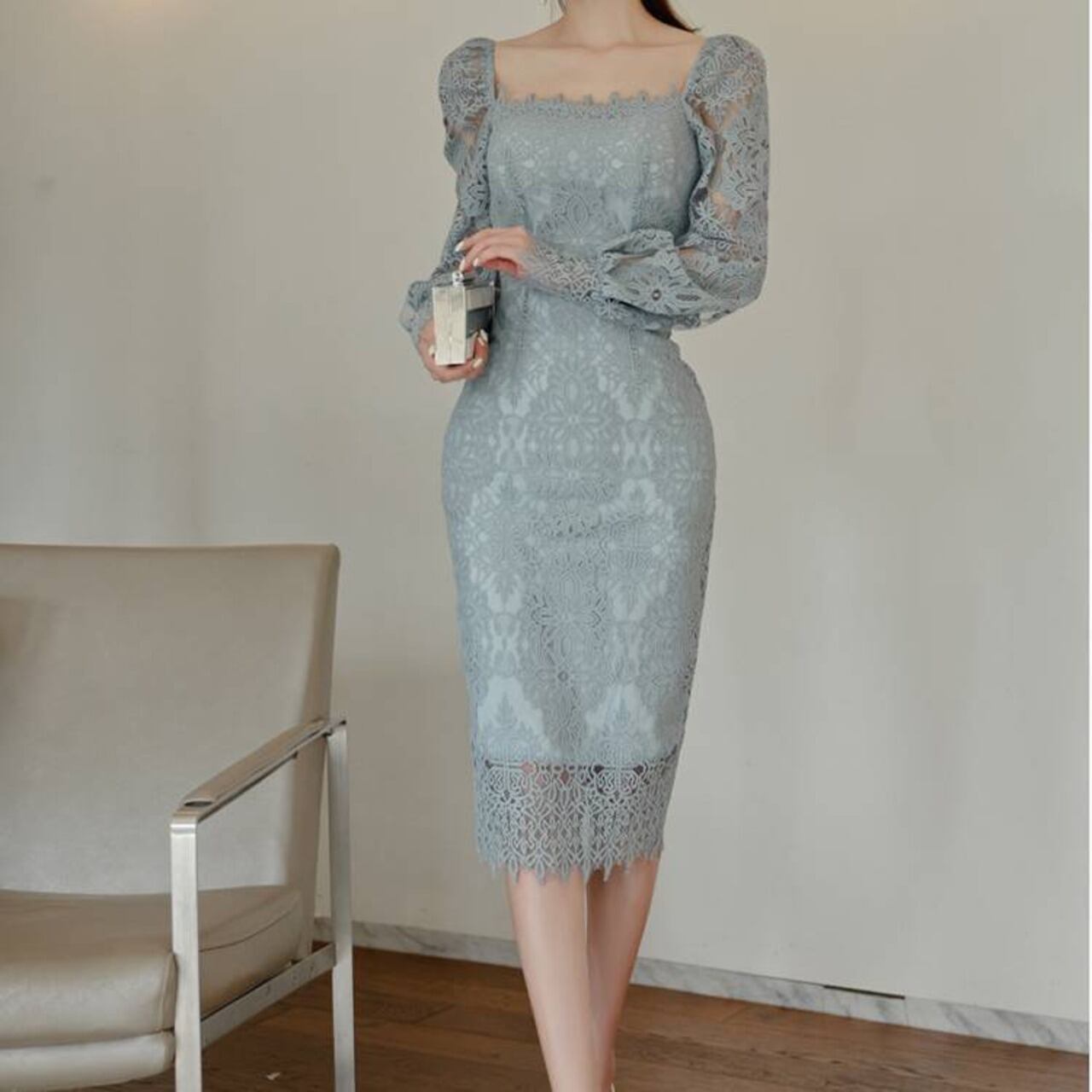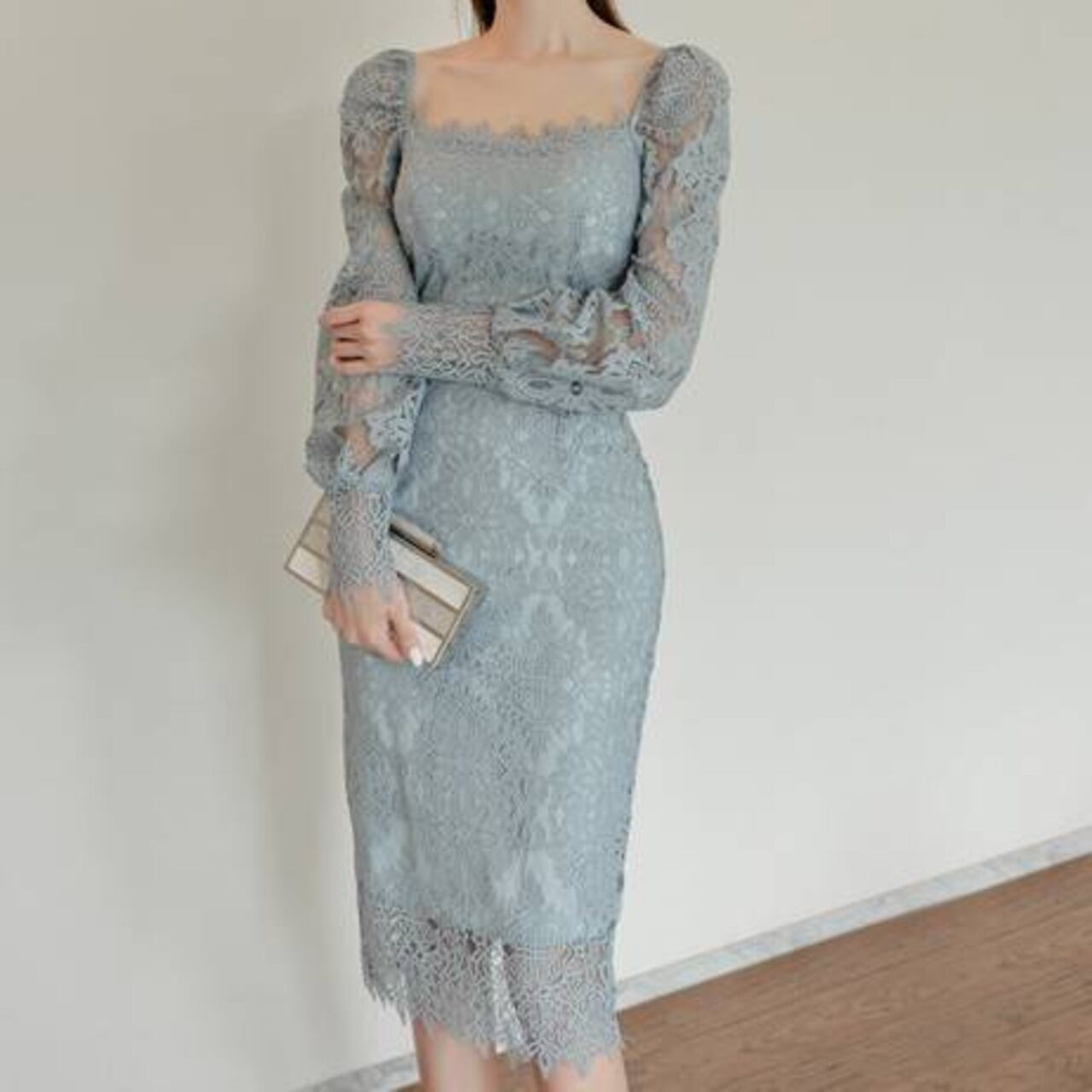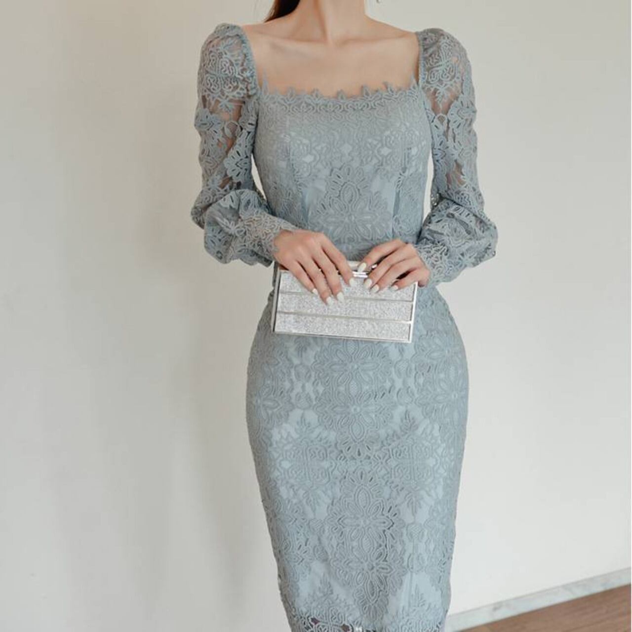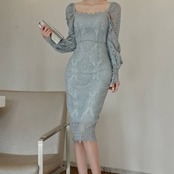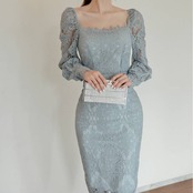 レースタイトドレス スクエアネック ワンピース ミモレ丈 タイトドレス 長袖レース エレガント 大人可愛い きれいめ 上品 パーティードレス 結婚式 二次会 お呼ばれ ドレス ワンピース ブルー フォーマル 韓国風 キレイ系 体型カバー 美シルエット スリムフィット レディース 春夏 秋冬 デート 食事会 発表会 同窓会 大人女子 上品ワンピース C-OSS0255