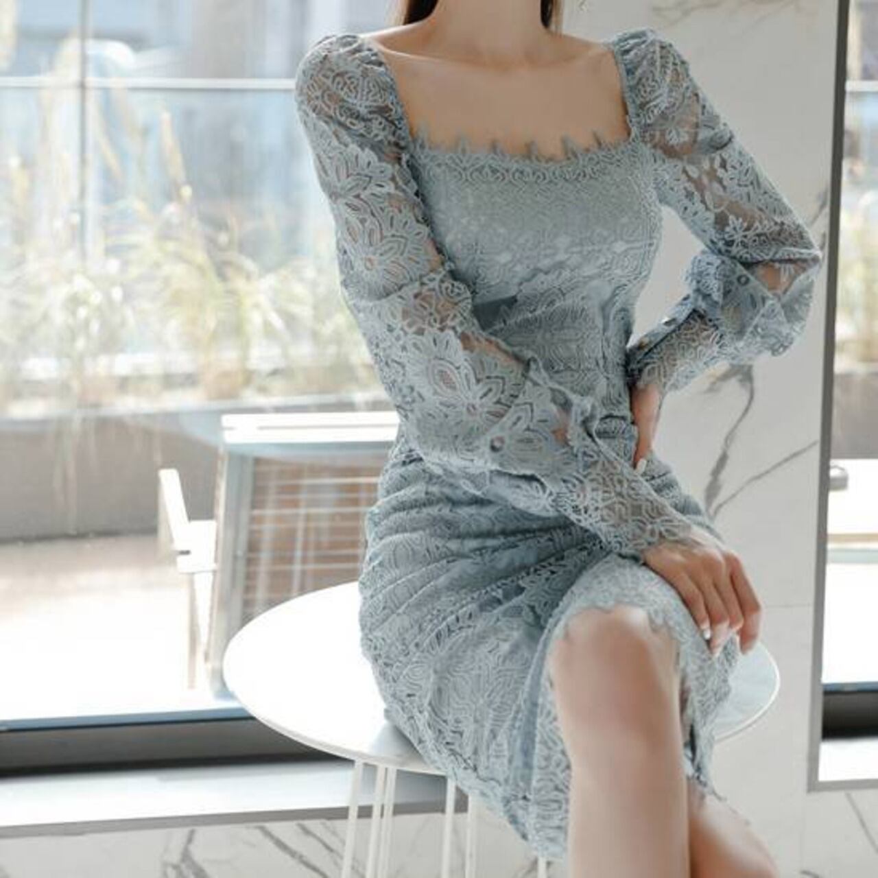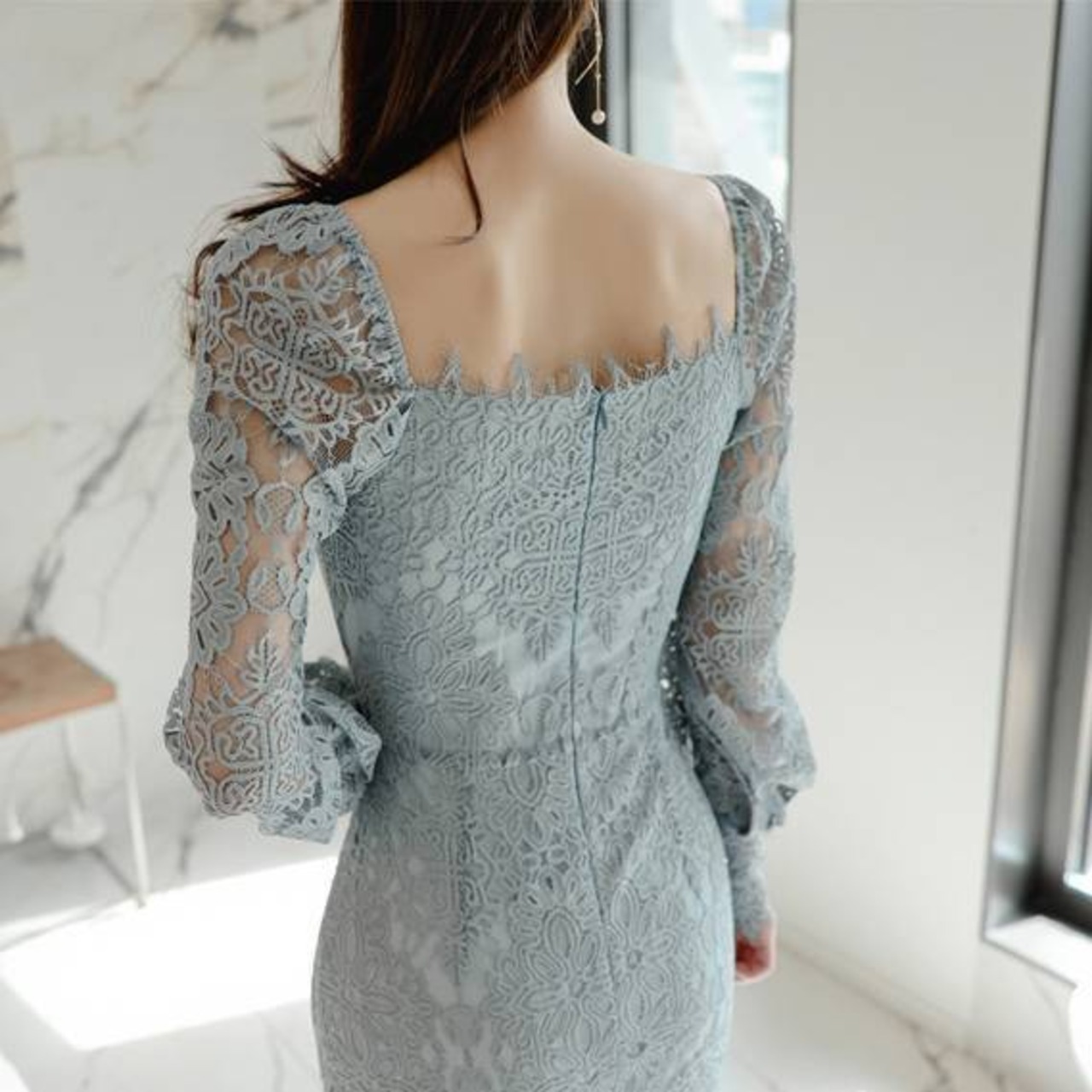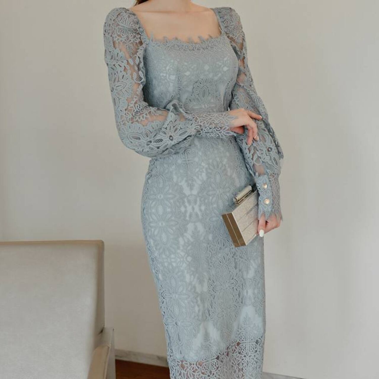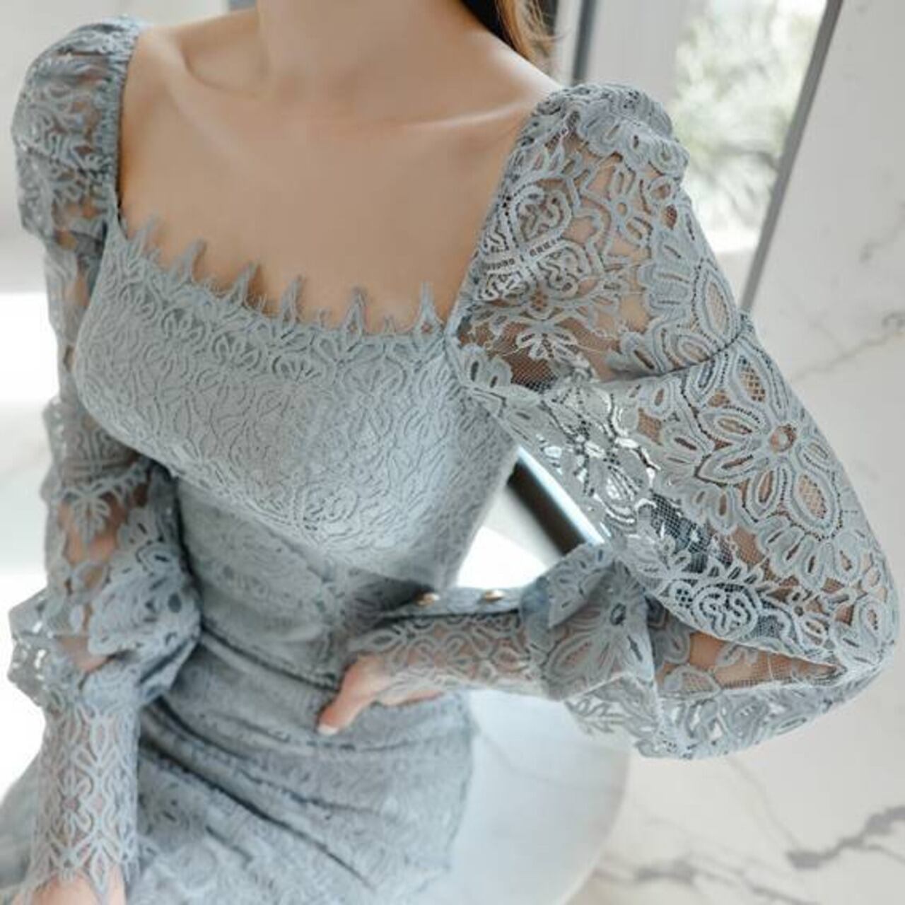 レースタイトドレス スクエアネック ワンピース ミモレ丈 タイトドレス 長袖レース エレガント 大人可愛い きれいめ 上品 パーティードレス 結婚式 二次会 お呼ばれ ドレス ワンピース ブルー フォーマル 韓国風 キレイ系 体型カバー 美シルエット スリムフィット レディース 春夏 秋冬 デート 食事会 発表会 同窓会 大人女子 上品ワンピース C-OSS0255