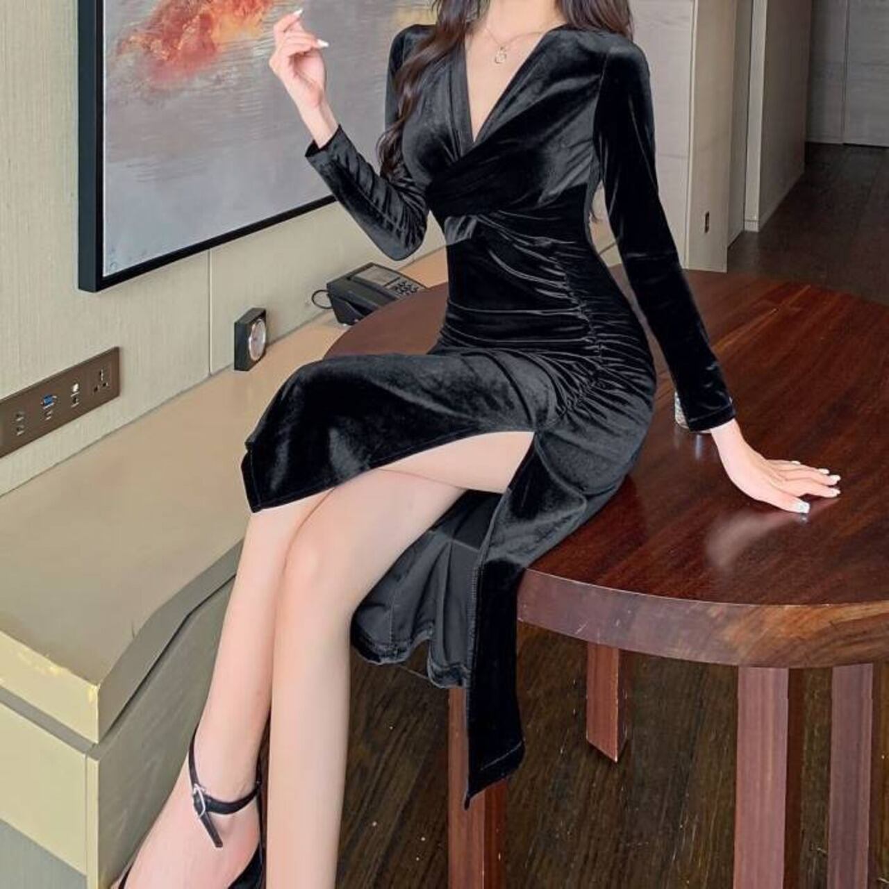 商品名:ベロアタイトワンピース 長袖 スリット入り タイトドレス