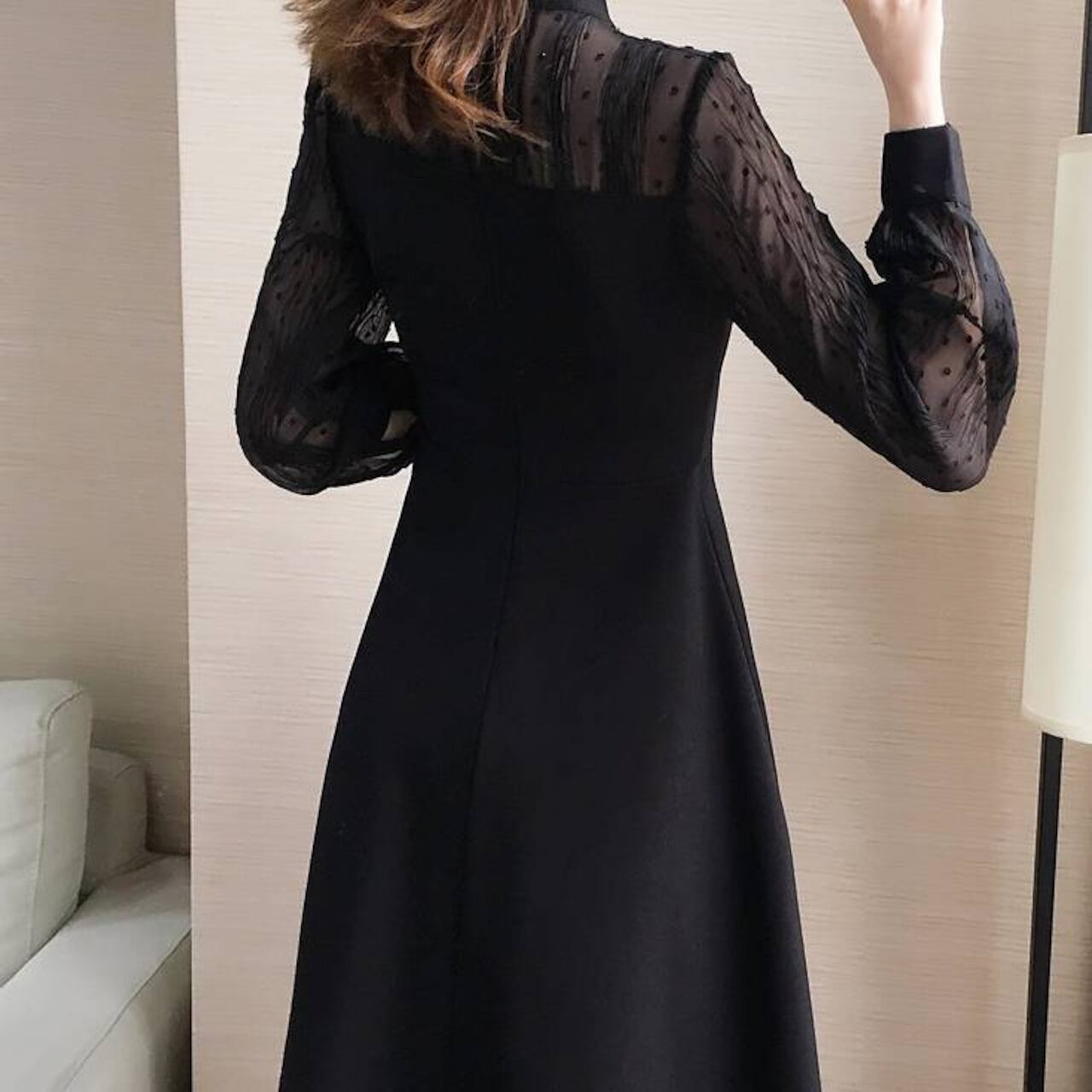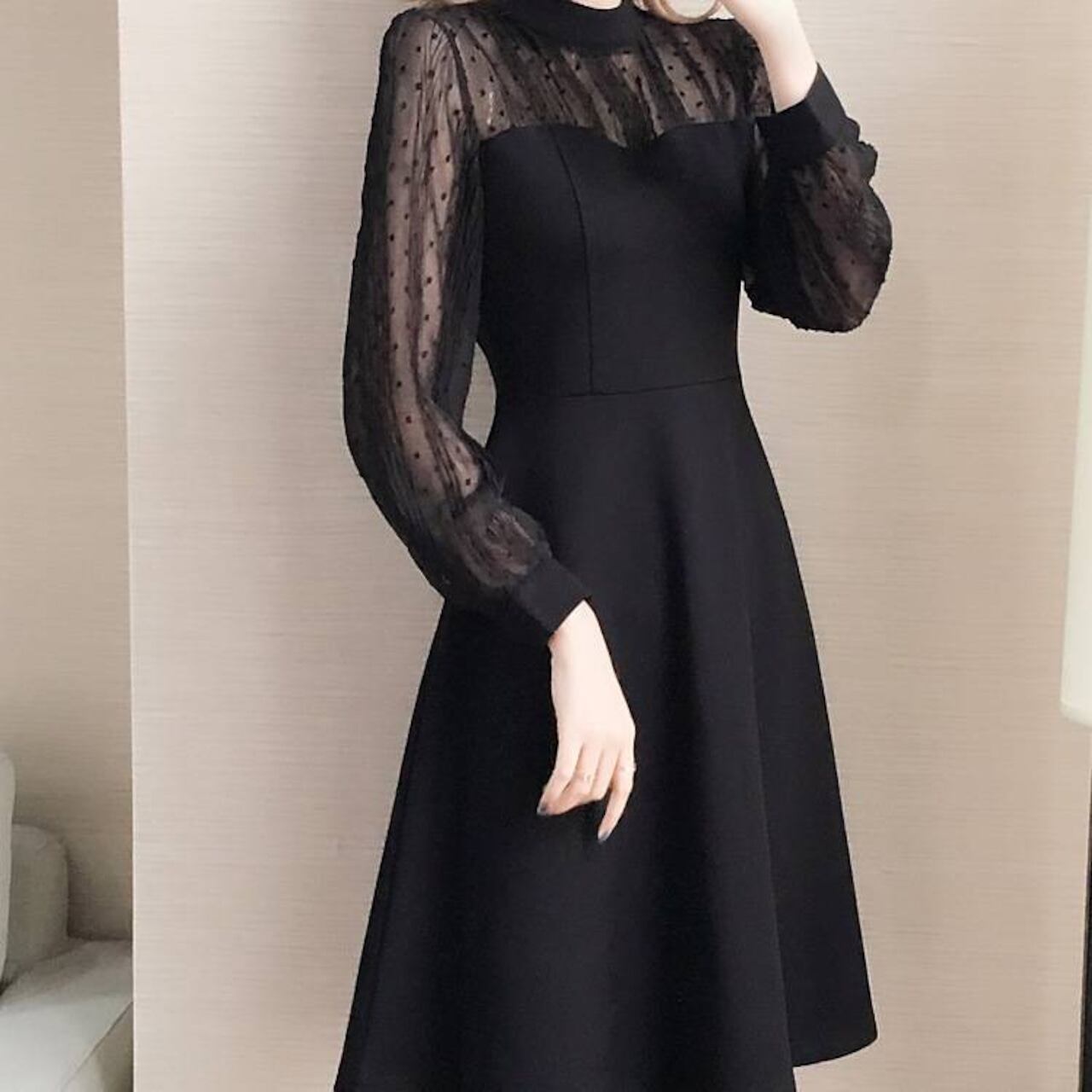 エレガント ドットチュール 切り替え ワンピース フレアワンピース 長袖 シースルー袖 きれいめ ブラック 上品 可愛い 大人女子 デート 通勤 お呼ばれ 体型カバー レディース ワンピース 春夏 秋冬 コーデ 人気 おしゃれ C-OSS0237