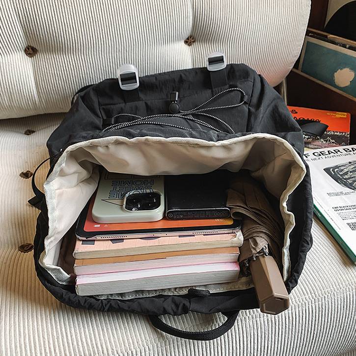 ノート・タブレット・財布・ポーチなど、日常に必要なアイテムをまとめて収納可能。巾着式の開閉に加え、フロントファスナーポケット付きで、小物の出し入れもスムーズです。軽さと実用性を兼ね備えた、使い勝手の良さが魅力です。
