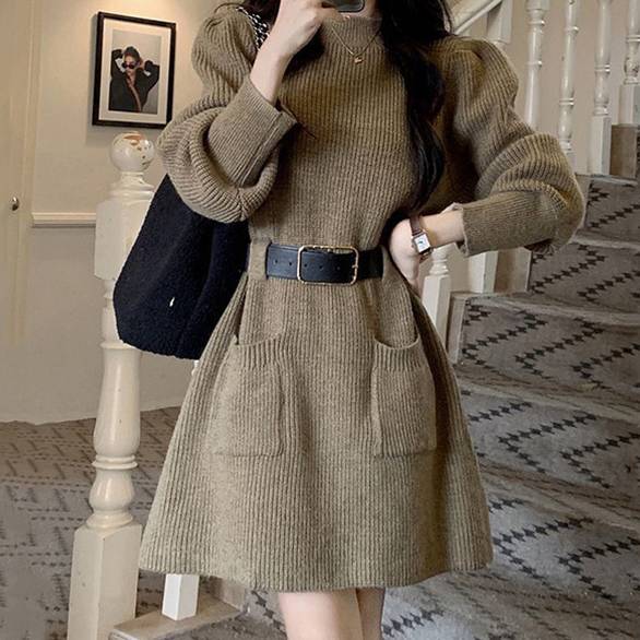 ふんわりした袖とAラインのシルエットは体型カバーにも優れており、気になる腰回りやお腹周りも綺麗に見せてくれます。左右には便利なポケット付きで実用性もバッチリ。カジュアルにも綺麗めにも合わせやすい万能ニットワンピースです。
