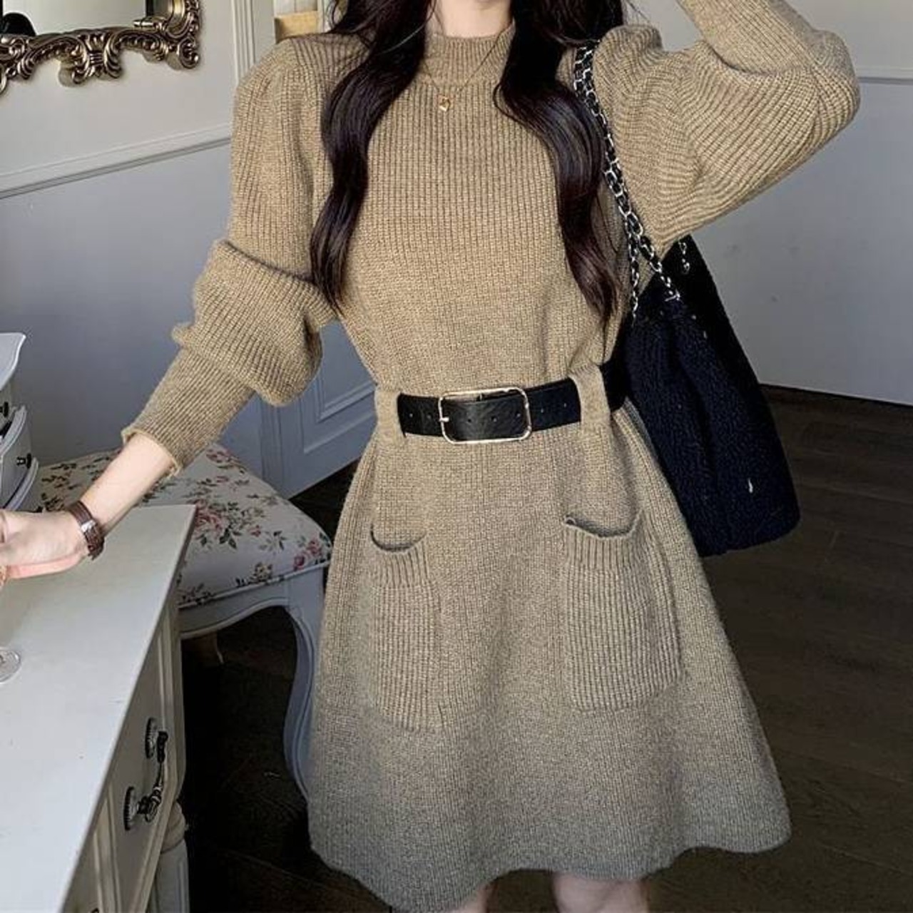 ロングブーツと小さめバッグを合わせるだけで、大人っぽく女性らしいシルエットが完成。ウエストベルトで引き締めてスタイルアップ効果も抜群。