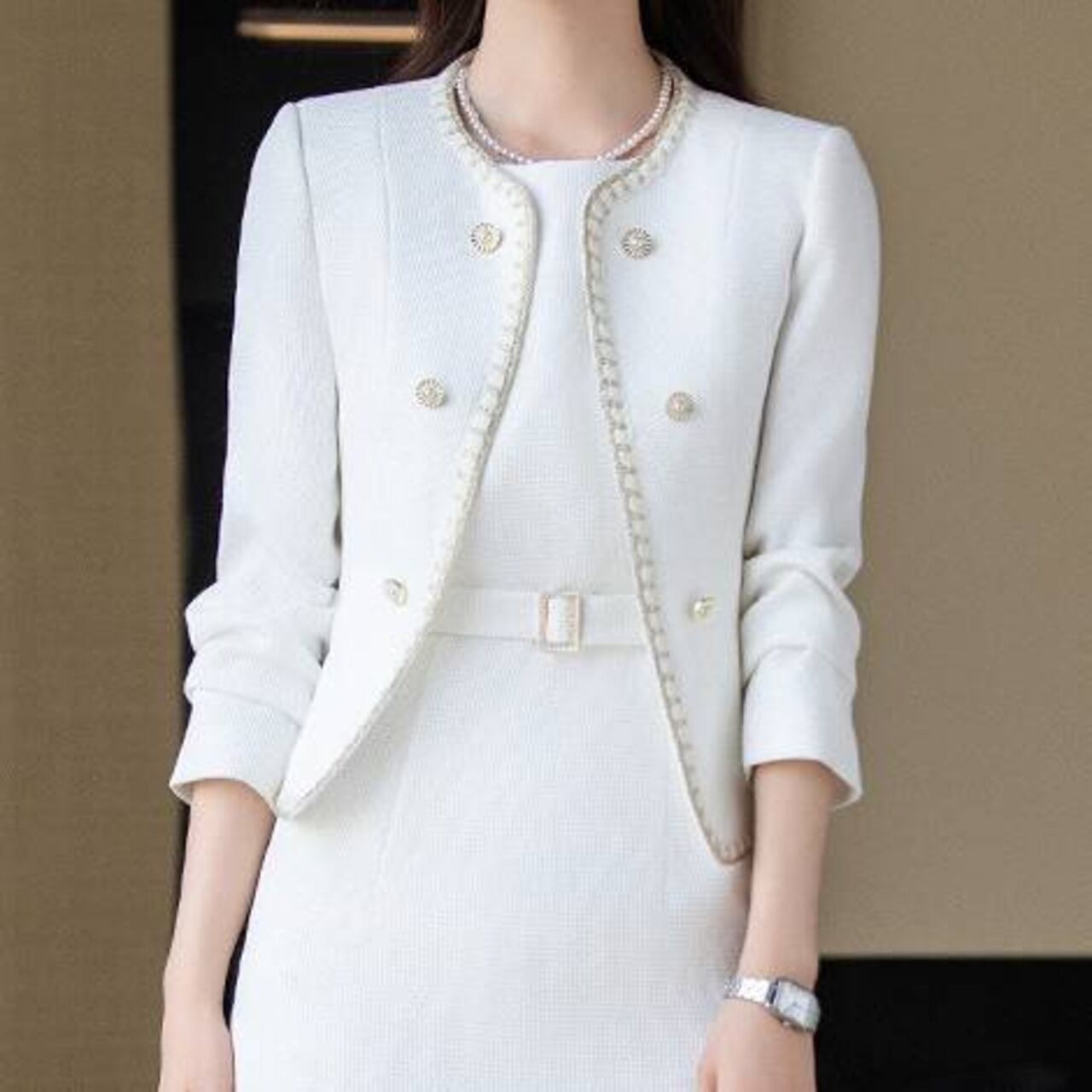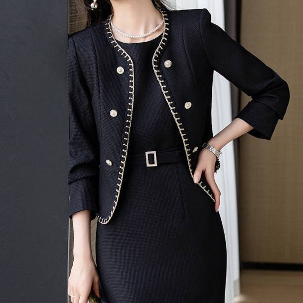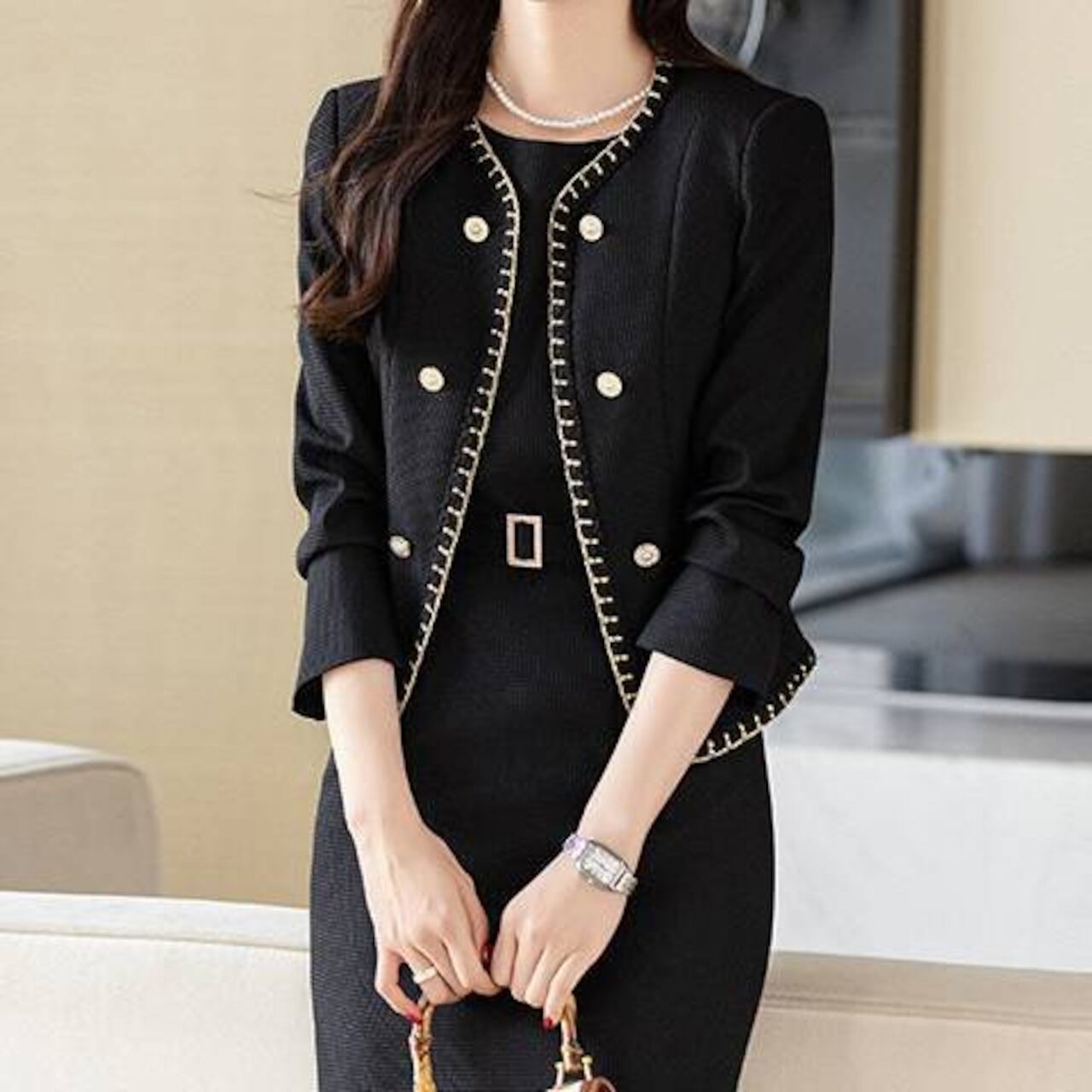 ・高級感あふれるツイード風デザインと金ボタンの上品ディテール