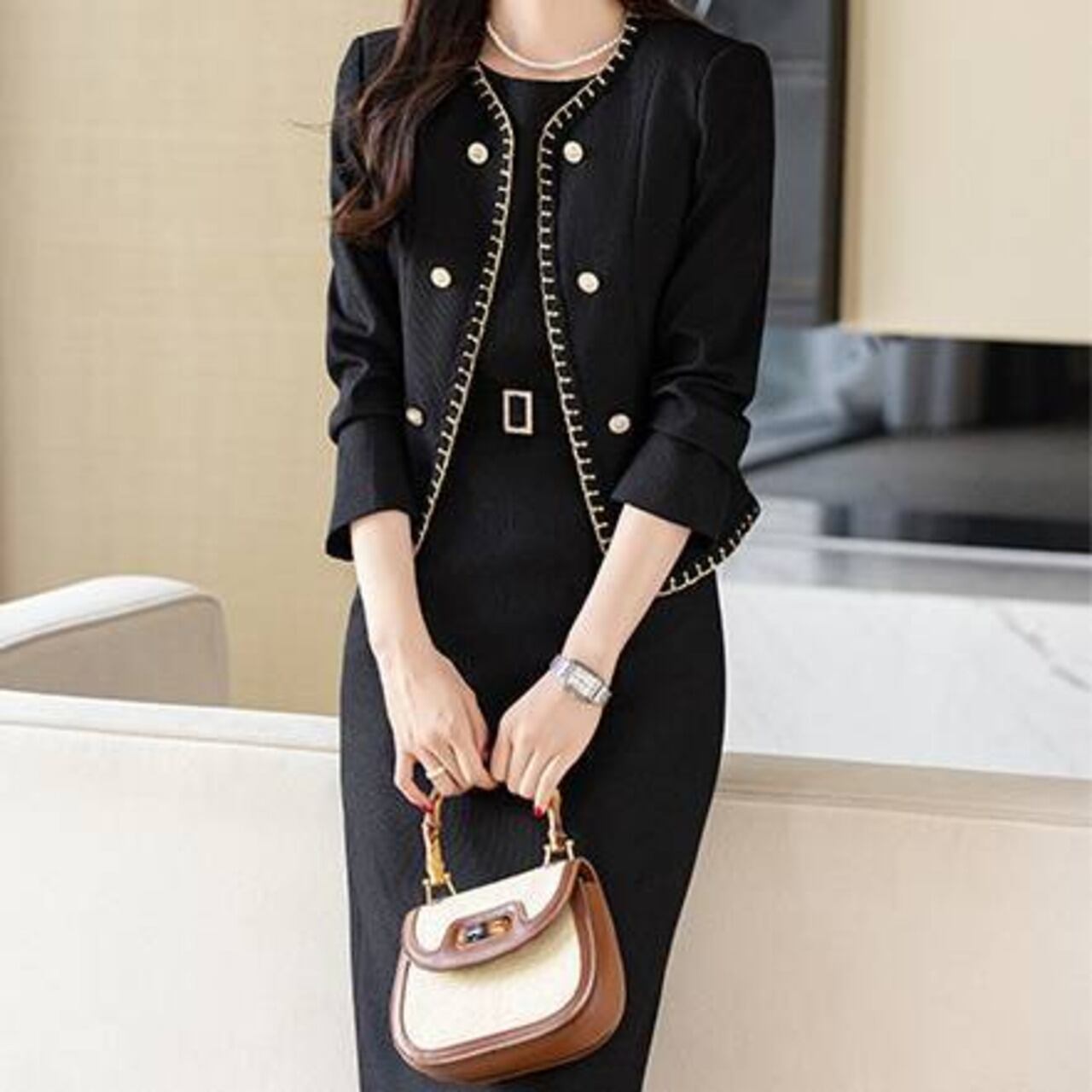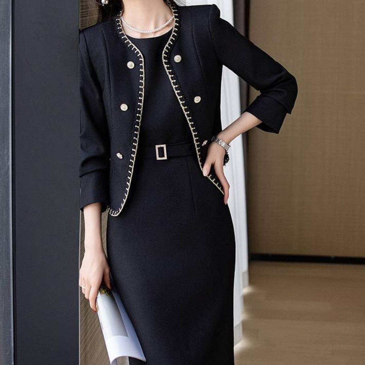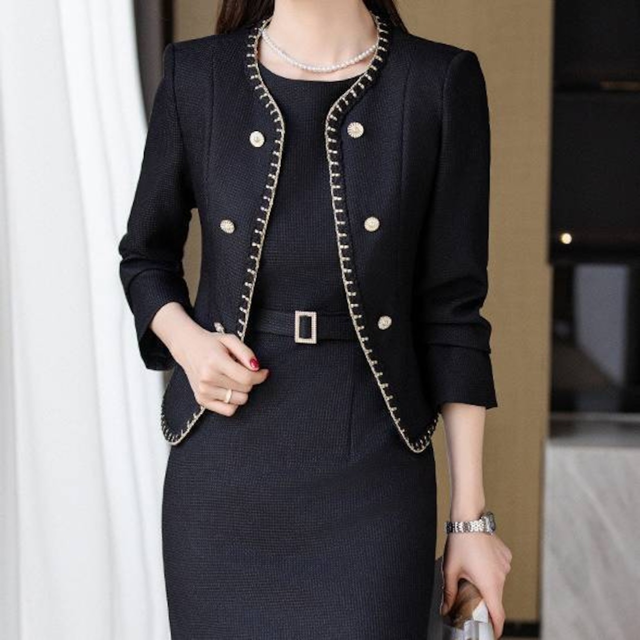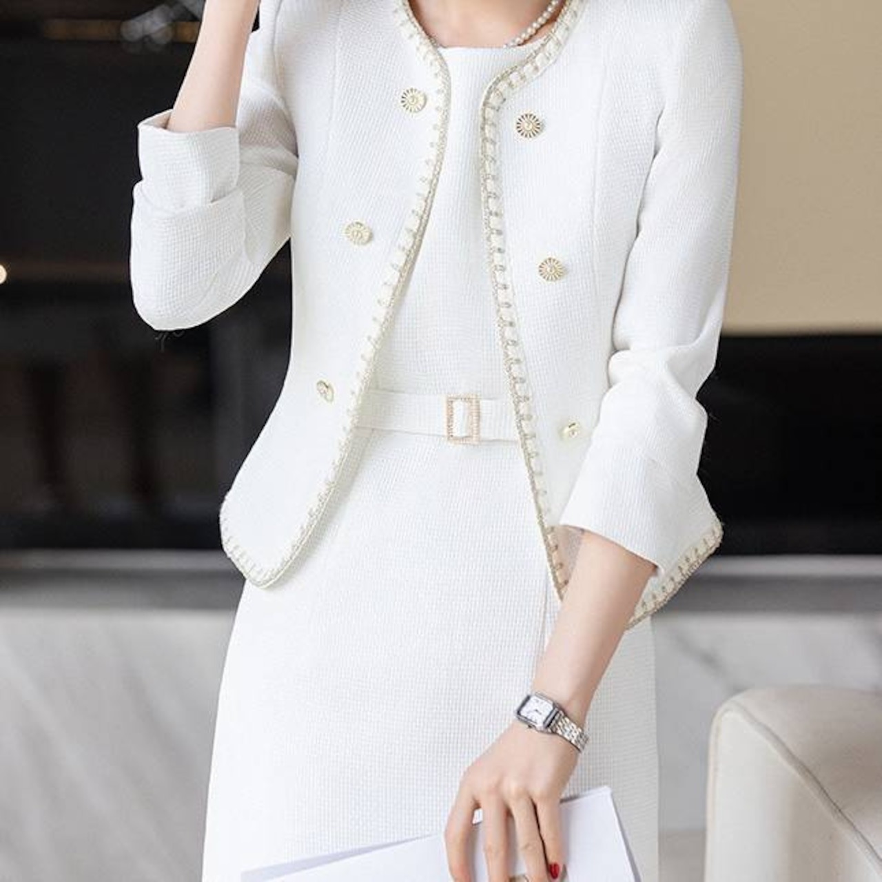・高級感あふれるツイード風デザインと金ボタンの上品ディテール