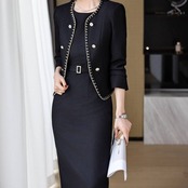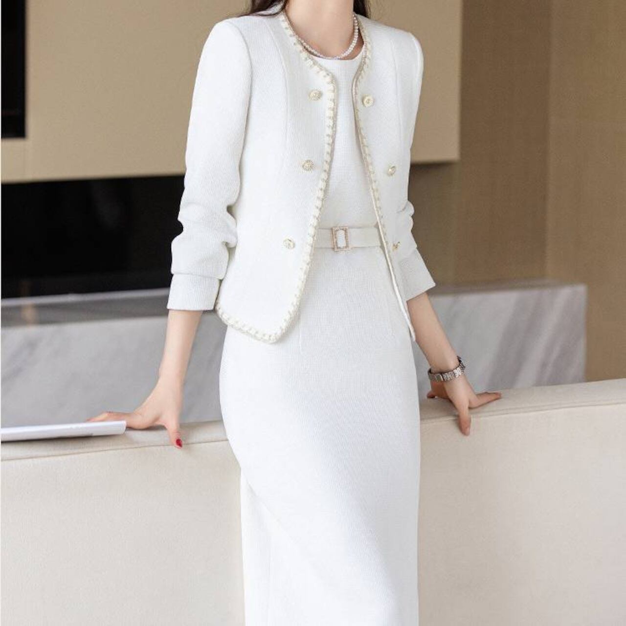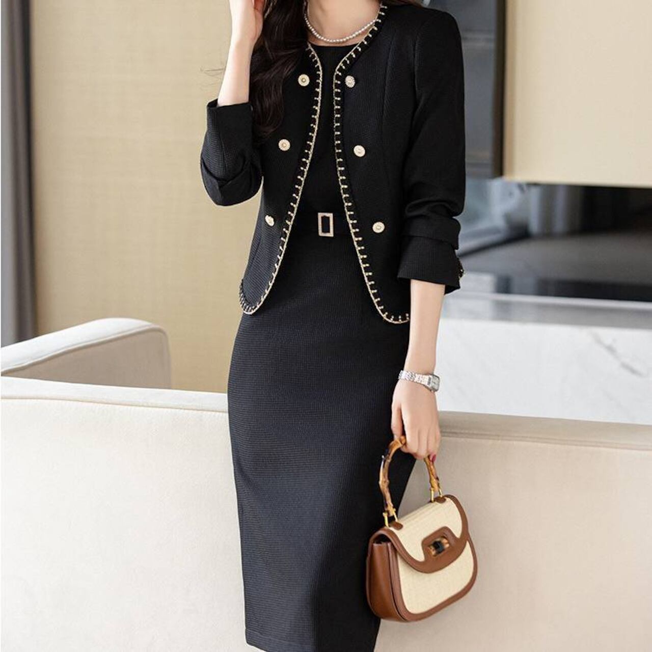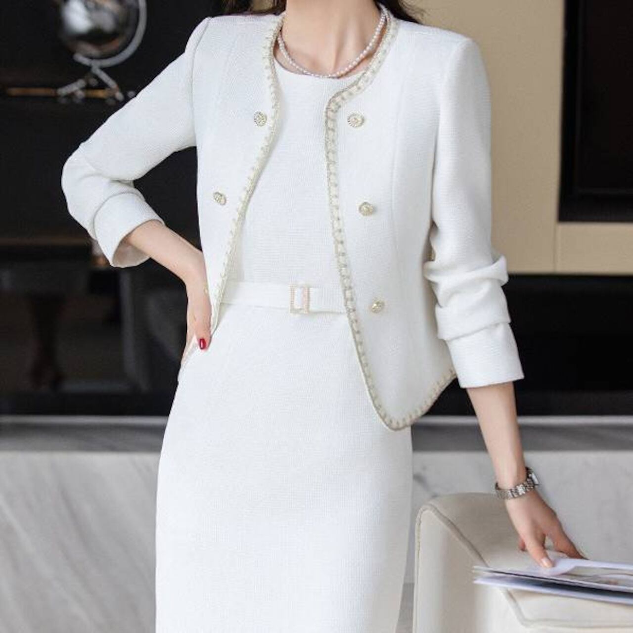 上品でクラシカルな雰囲気漂う、ツイード風ジャケット×ワンピースのセットアップ。