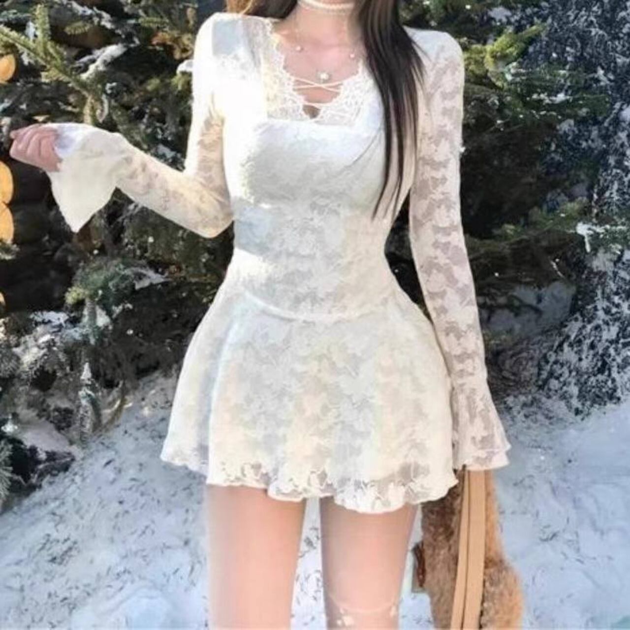 冬の街並みに映える、上品で可憐なホワイトレースワンピース。繊細な総レースが女性らしさを引き立て、ミニ丈のフレアシルエットが自然なスタイルアップを叶えます。長袖レースの透け感がほんのり色気を添えつつ、清楚で大人可愛い印象に仕上がる一枚です。