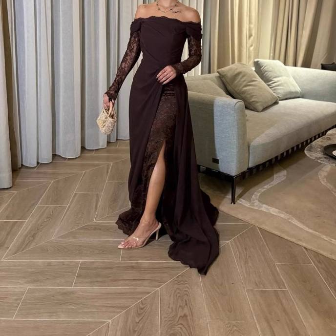 ダークブラウン オフショルダー ロングドレス レーススリット ドレス レディース パーティードレス 大人 上品 きれいめ セクシー 結婚式 二次会 お呼ばれ 韓国風 ロング丈 スリットドレス 高級感 エレガント スタイルアップ 美シルエット C-OSS0236