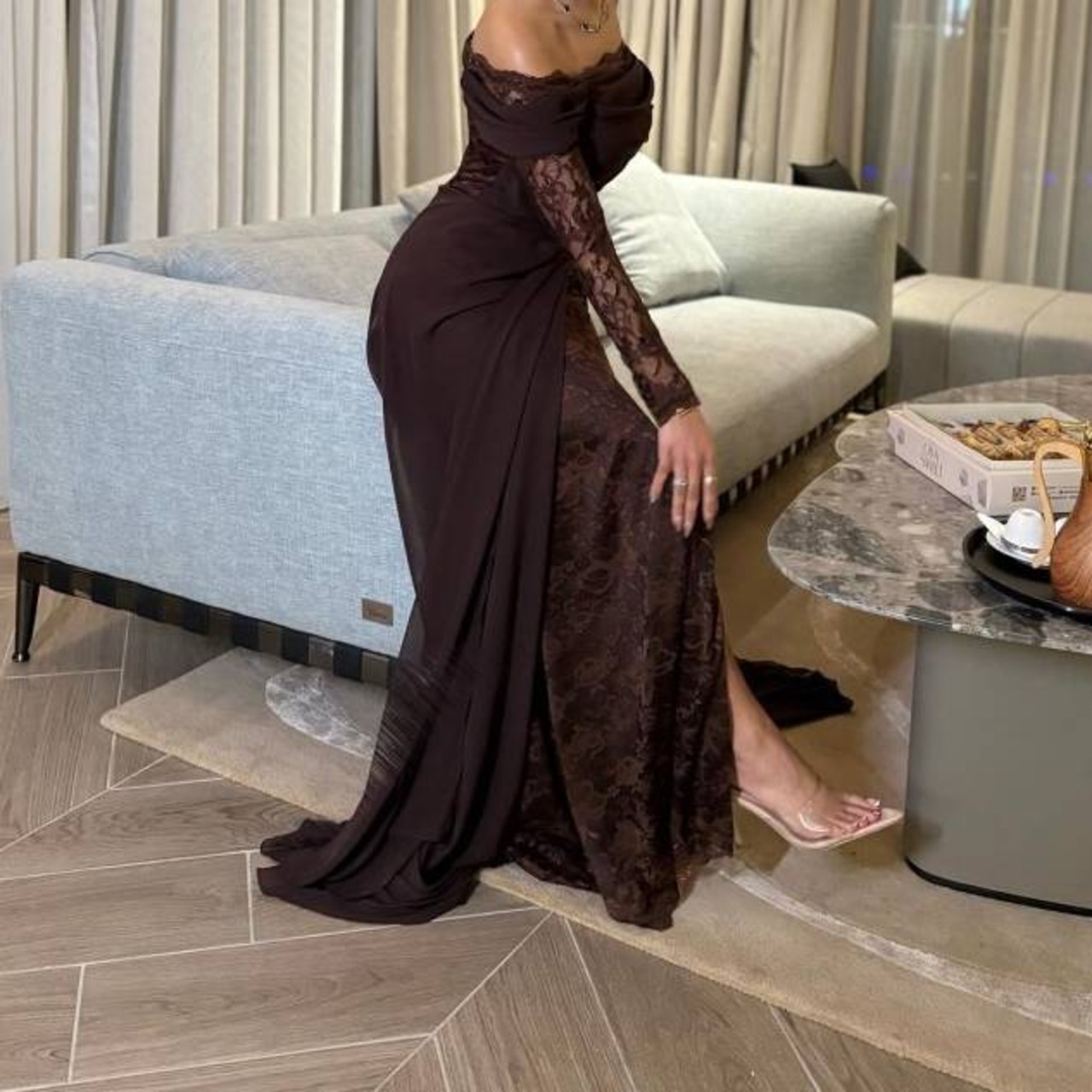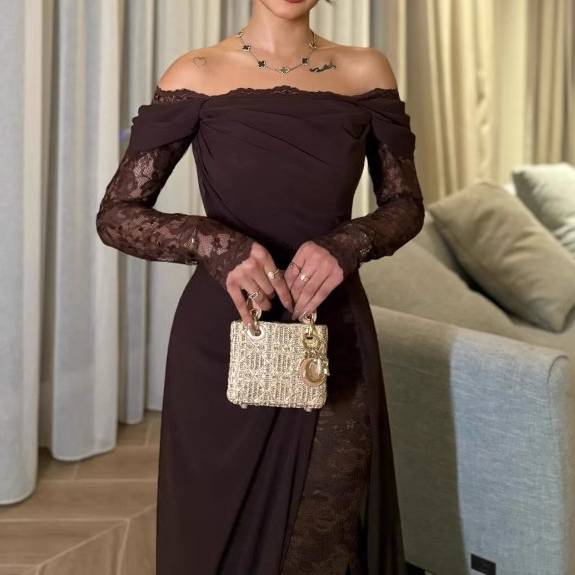 商品名:ダークブラウン レーススリット オフショルダーロングドレス