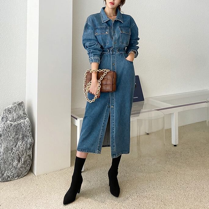 ワンピース ミモレ レディース デニム タイトワンピース ミディアムワンピ ロングワンピース ひざ丈 ひざ下 秋 冬 秋冬 春 アウター ロング丈 タイト デニムワンピース C-OAW1039