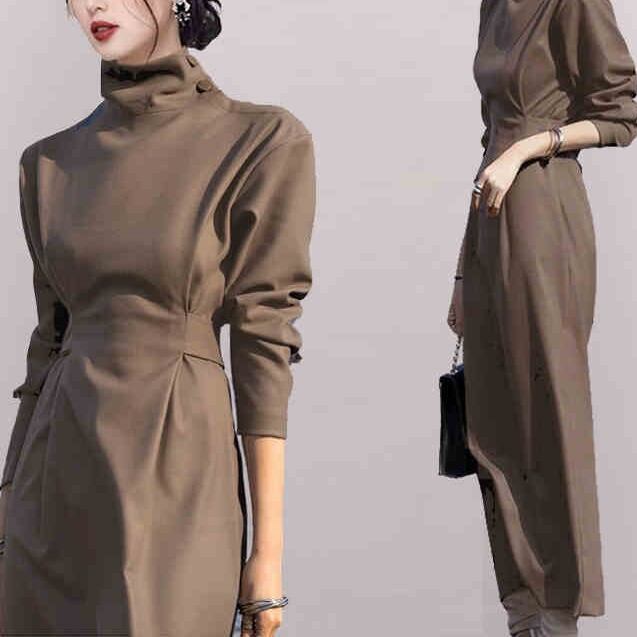 商品名:韓国風 シンプル 無地 ハイネック ロングワンピース