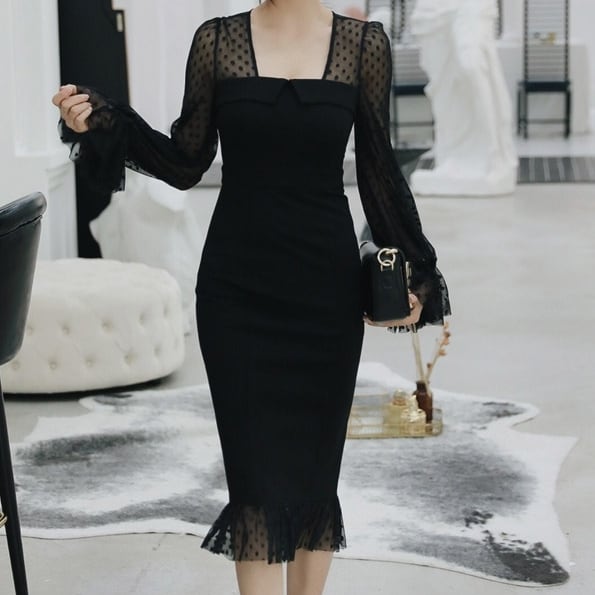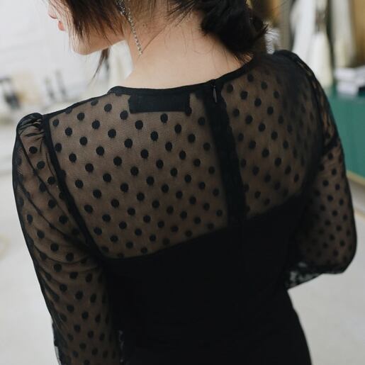 ドット柄シースルーのタイトワンピース。