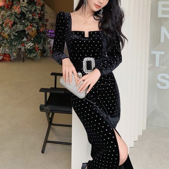 ワンピース レディース ミモレワンピース ロング ミモレ丈 ドット柄 パフスリーブ スクエアネック ブラック 黒 ドレスワンピース ひざ丈 ひざ下 ワンピースドレス 春 夏 春夏 お呼ばれ パーティー ドレス ロングワンピース C-OAW1037
