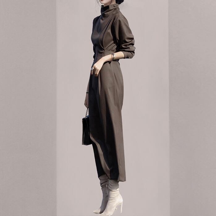 商品名:韓国風 シンプル 無地 ハイネック ロングワンピース