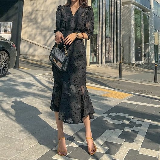 商品名:Vネック シースルー パフスリーブ ミモレ丈ワンピース