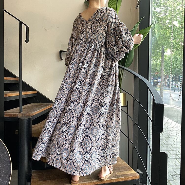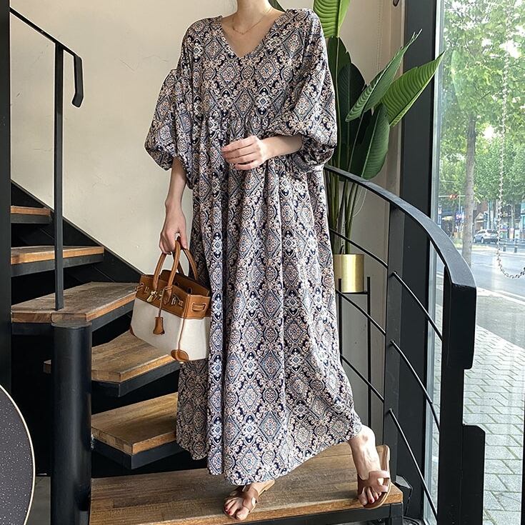 商品名:レトロ エスニック柄 Vネック ロングワンピース