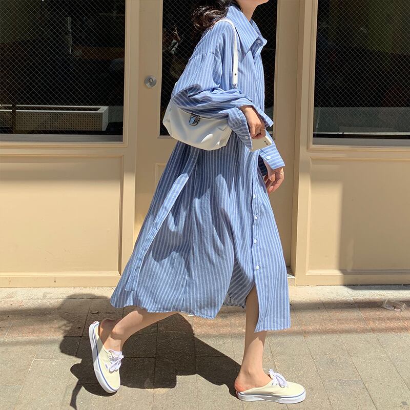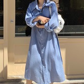 ストライプ柄ロングシャツワンピース。