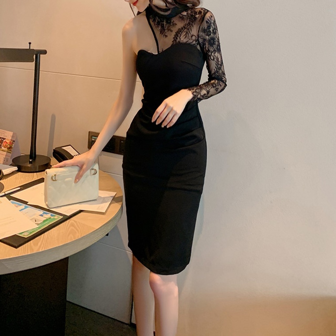 商品名:シースルー レース ハイネック タイトワンピース ドレス