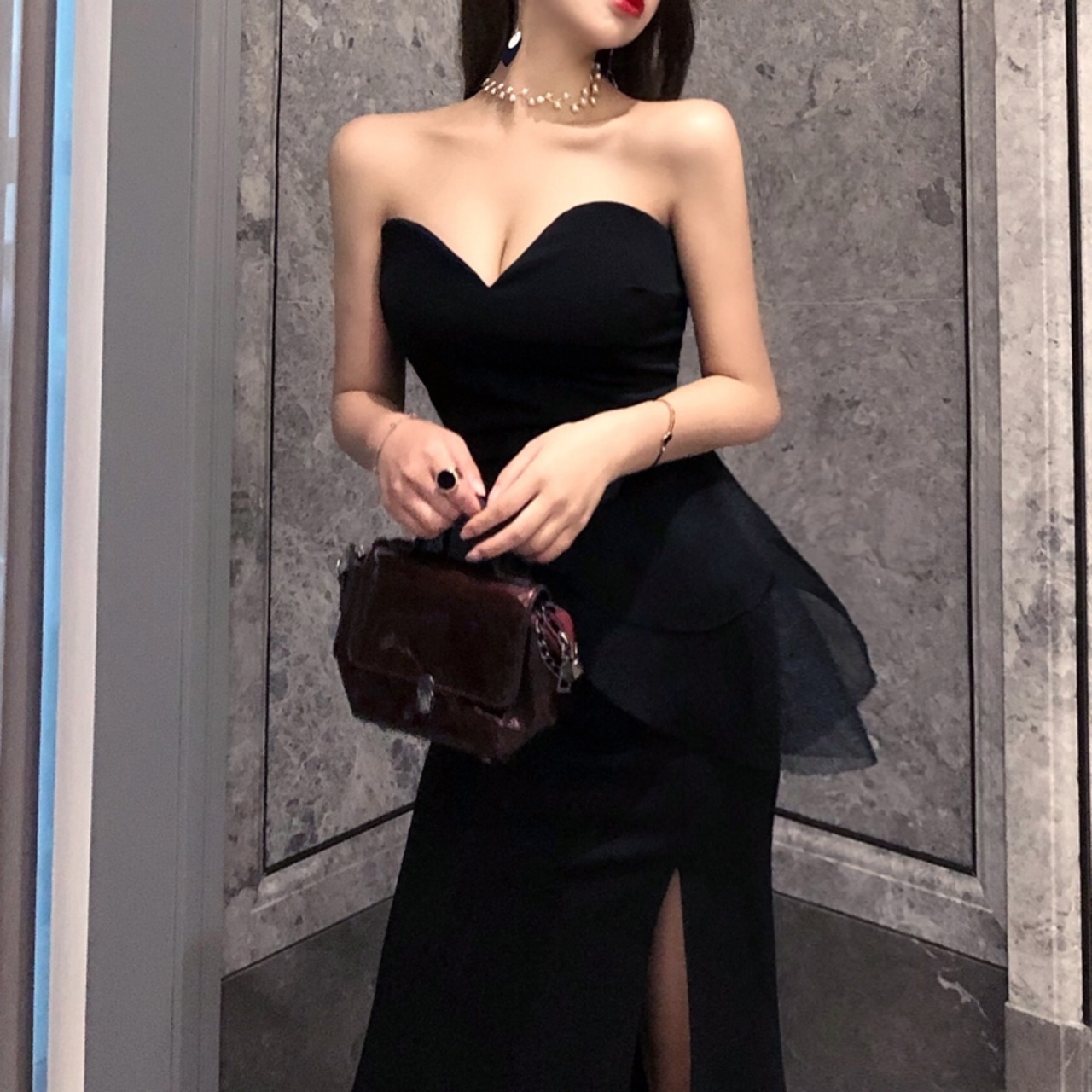 個性的なデザインで、ビスチェタイプのブラックドレス。